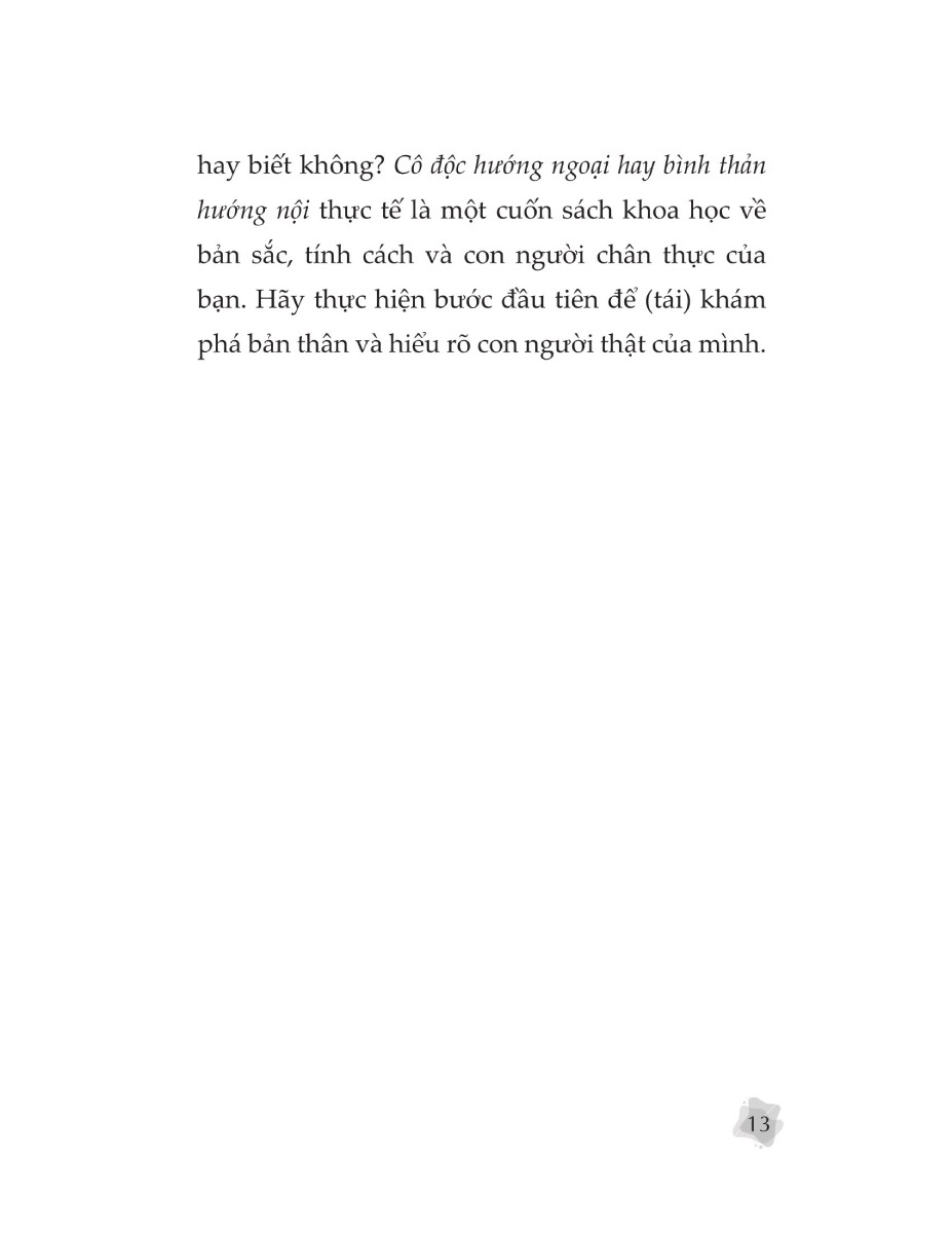 Dựa trên các nghiên cứu khoa học, cuốn sách “Cô độc hướng ngoại hay bình thản hướng nội” giải mã bản chất hướng nội, hướng ngoại một cách thực tế và dễ hiểu nhất, để ta hiểu hơn về chính mình và xóa bỏ những nhầm tưởng. Đây là một cuốn sách giàu tính thực chiến, đi sâu vào nguồn gốc của các kiểu tính cách, qua đó giải mã tâm lý và hành vi của con người trong những tình huống cụ thể. Chúng ta có thể tận dụng những kiến thức này để cuộc sống của mình thêm phong phú, cũng như thoải mái hơn với cá tính riêng của bản thân và đồng cảm với những người có phong cách sống khác biệt.