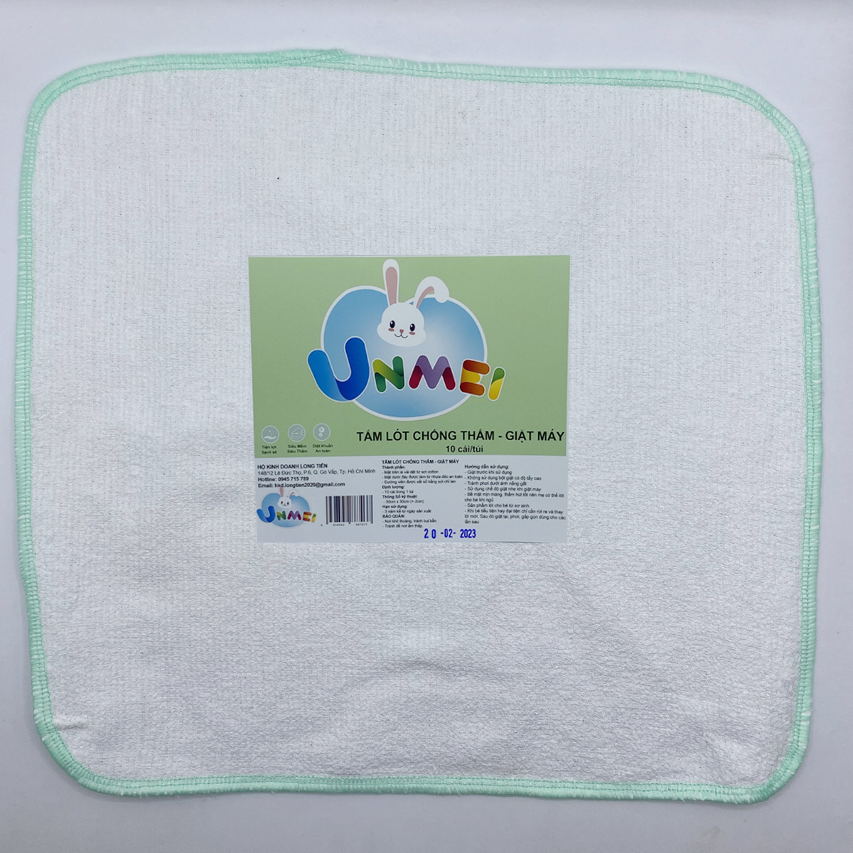 SET 10 TẤM LÓT PHÂN SU CHỐNG THẤM CHO BÉ DƯỚI 3 THÁNG THƯƠNG HIỆU UNMEI KÍCH THƯỚC: 30x30cm +-2cm Thương Hiệu: Unmei Xuất Xứ: Việt Nam Đặc Biệt: PHẦN VIỀN VẮT SỔ LÀ DÙNG GIẶT MÁY VÀ LÀ LOẠI TỐT HƠN Ạ. - Tấm lót phân su chống thấm dành cho bé sơ sinh được sản xuất tại Việt nam, hàng chất lượng không gây hại sức khỏe người dùng