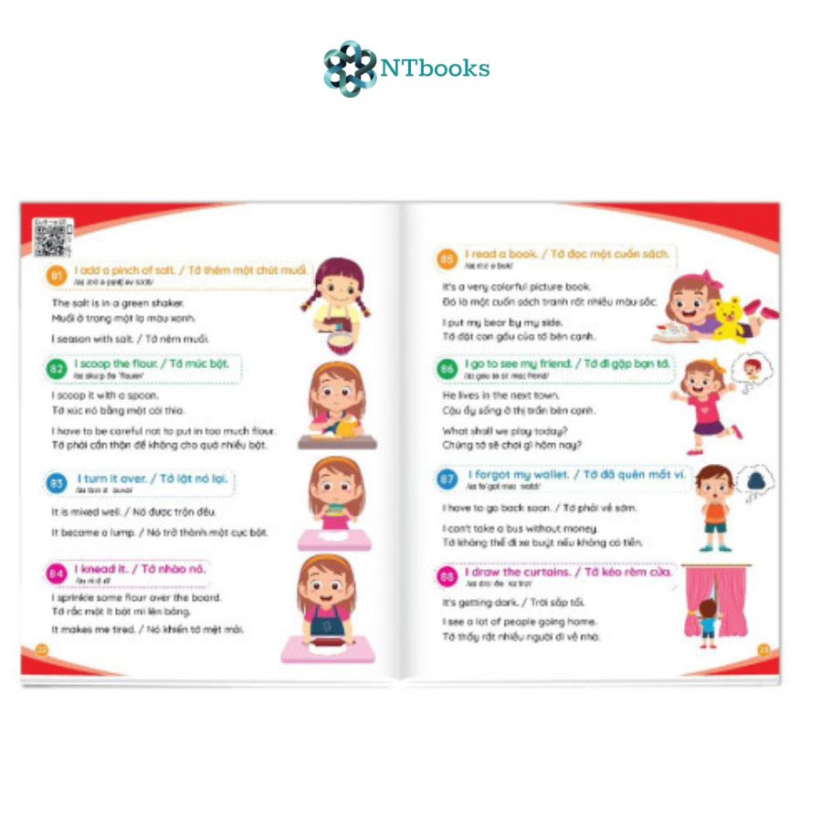 Sách có kèm file nghe quét mã QR với giọng đọc tiếng Anh chuẩn để cha mẹ và con cùng nghe và tắm ngôn ngữ mỗi ngày.