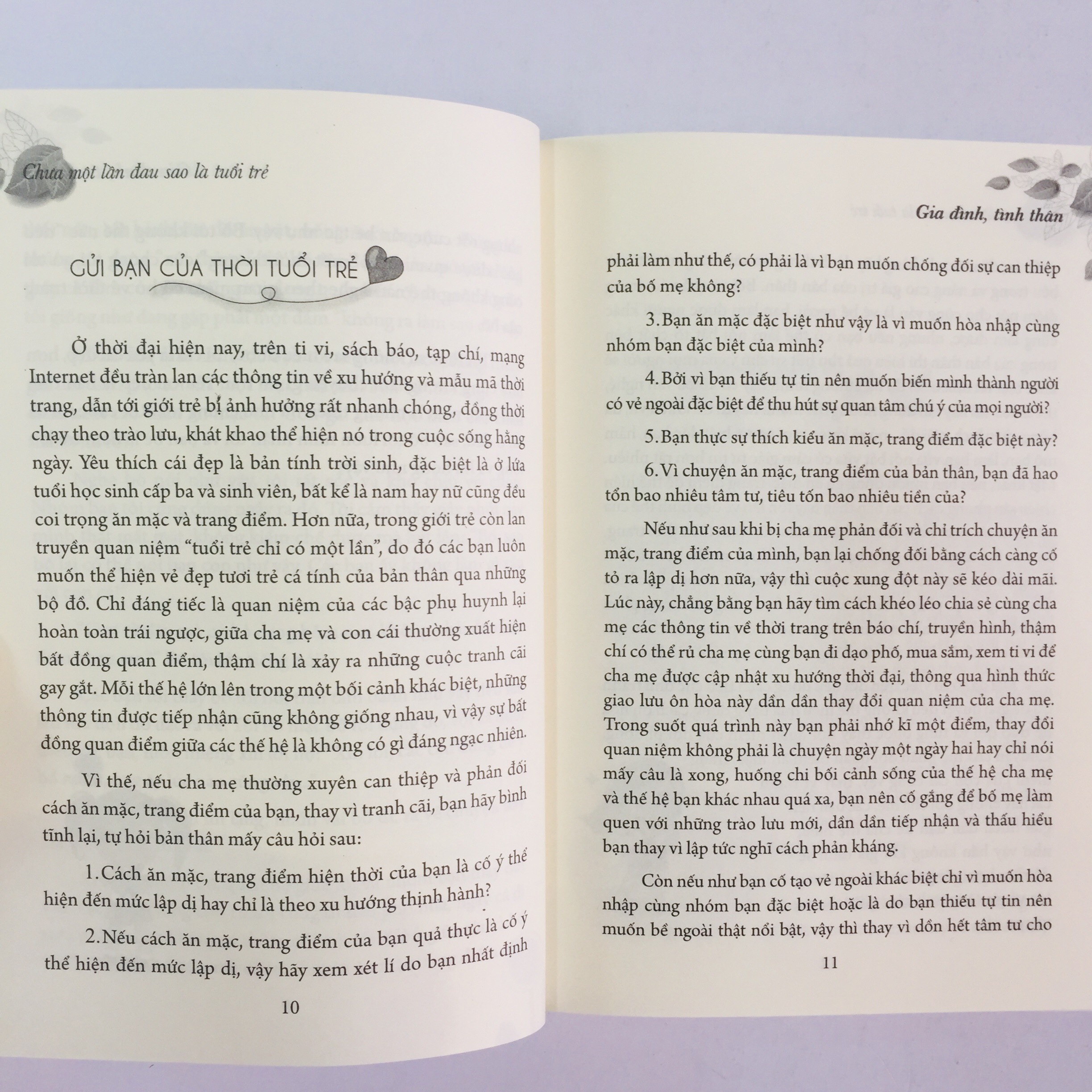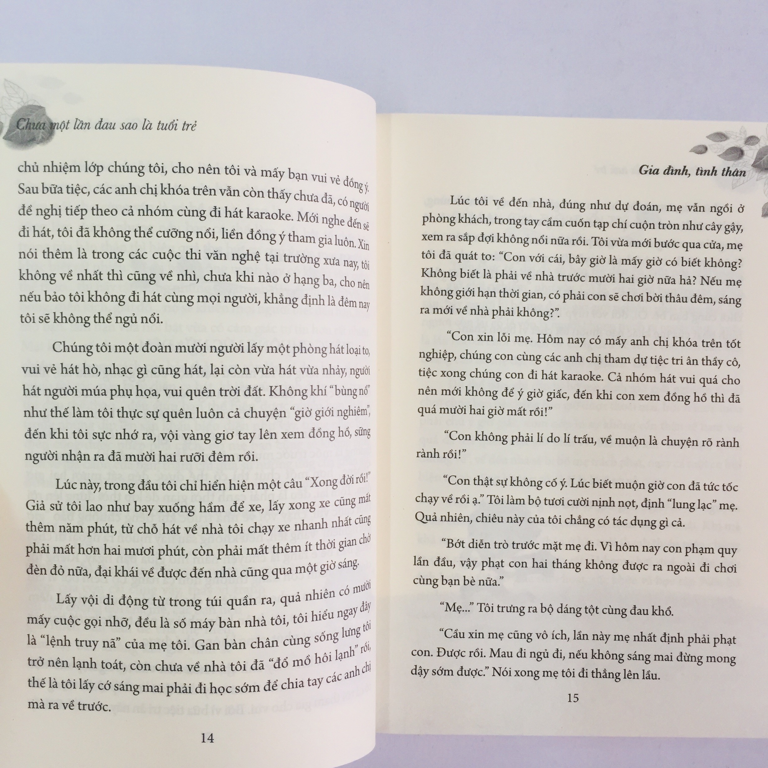Chưa Một Lần Đau Sao Là Tuổi Trẻ Chỉ cần bên cạnh bạn có những đôi tay sẵn sàng chìa ra nâng đỡ, có những bờ vai cho bạn tựa vào, có những cái ôm động viên khích lệ, vậy là quá trình trưởng thành của bạn vĩnh viễn không hoài phí mà còn nhận được nhiều hơn – Từ Lỗi Tuyên Tuổi trẻ là giai đoạn đẹp nhất của cuộc đời. Tuổi trẻ là chuyến hành trình một chiều, và những nỗi ưu phiền, rắc rối xoay quanh vấn đề học tập, tình bạn, tình yêu các mối quan hệ trong gia đình, nhà trường và ngoài xã hội luôn là một thế giới đầy thử thách  và thú vị. Chúng ta đều là những chú chim nhỏ háo háo bay ra ngoài kia khám phá thế giới, cho dù có bao nhiêu cay đắng, bao nhiêu vấp ngã, thì quá trình này vẫn luôn đầy ý nghĩa và đây chắc chắn sẽ là giai đoạn khó quên trong đời bạn. Hãy mang theo cuốn sách này và lòng can đảm tiến về phía trước để có được những trải nghiệm cảm nhận và tìm ra lời giải cho những nỗi đau đớn mà bạn đang ôm giữ trong lòng. Làm Thế Nào Để Ôm Một Chú Nhím - 12 Bí Quyết Kết Nối Với Trẻ Vị Thành Niên Ở sở thú, có những loài vật ôm được và có những loài “không thể ôm được”. Nhím có thể được xếp vào nhóm thứ hai bởi lớp lông nhọn hoắt được chúng dựng lên mỗi khi đánh hơi thấy nguy hiểm. Thanh thiếu niên cũng như vậy. Chúng gai góc (hoặc thích tỏ ra gai góc). Chúng có xu hướng dựng lên một hàng rào vô hình ngăn cản ta tiếp cận, giống như bộ lông nhọn hoắt của những chú nhím vậy. Tuy nhiên, có những nguyên tắc mà khi được tuân thủ sẽ giúp ta dễ dàng ôm được một chú nhím vào lòng. Và cũng có những bí quyết  sẽ giúp chúng ta vượt qua lớp hàng rào phủ đầy gai nhọn, phá vỡ bức tường ngăn cách do thanh thiếu niên dựng lên để có thể tạo nên sự khác biệt. Thẳm sâu trong thâm tâm, thanh thiếu niên rất mong bản thân được chấp nhận, được cần đến và được yêu thương. Việc ôm một chú nhím là một thách thức độc đáo, và việc xây dựng các mối quan hệ tích cực với thanh thiếu niên là việc vô cùng thiết yếu, sẽ làm phong phú cũng như biến đổi cuộc sống của chúng ta mãi mãi.