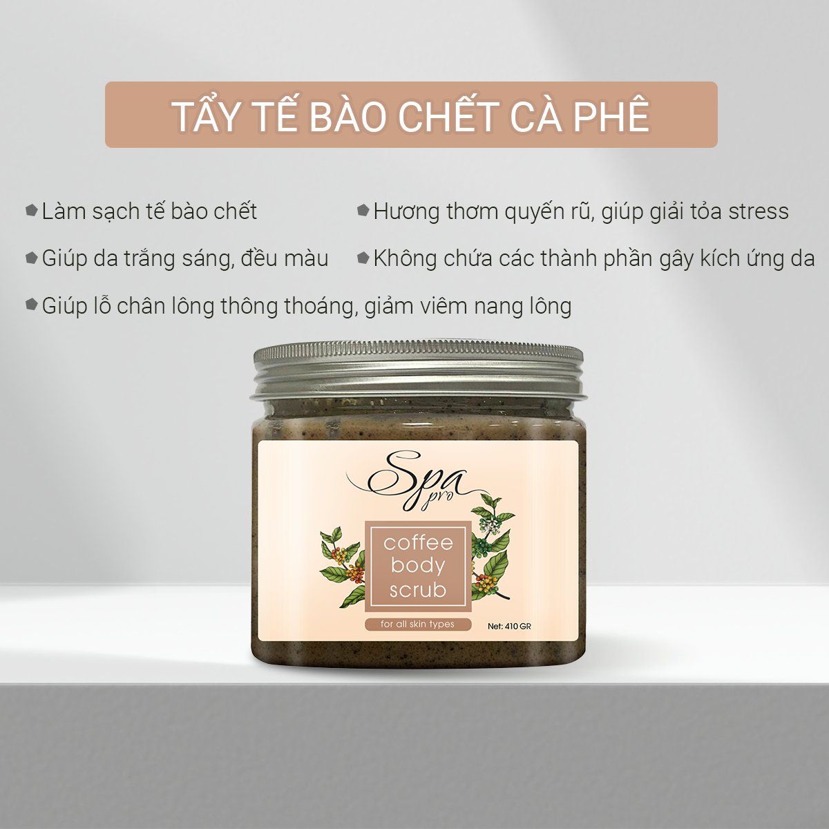 - TẨY TẾ BÀO CHẾT TOÀN THÂN COFFEE 410G THÀNH PHẦN: Công thức chứa các loại dược liệu tự nhiên: Cà Phê, Cam Thảo, Vitamin B3, Rau Má, Vỏ Dâu Tằm, Táo, Trà Xanh, Dướng Nhỏ, Tùng Nhung, Sơn Trà PHỐI HỢP VITAMIN E, PROVITAMIN B5 DƯỠNG DA MỀM MỊN, TRẮNG SÁNG. ỨNG DỤNG: Làm sạch cơ thể, làm sạch tế bào da chết, giúp lỗ chân lông thông thoáng, da tươi sáng mềm mại.