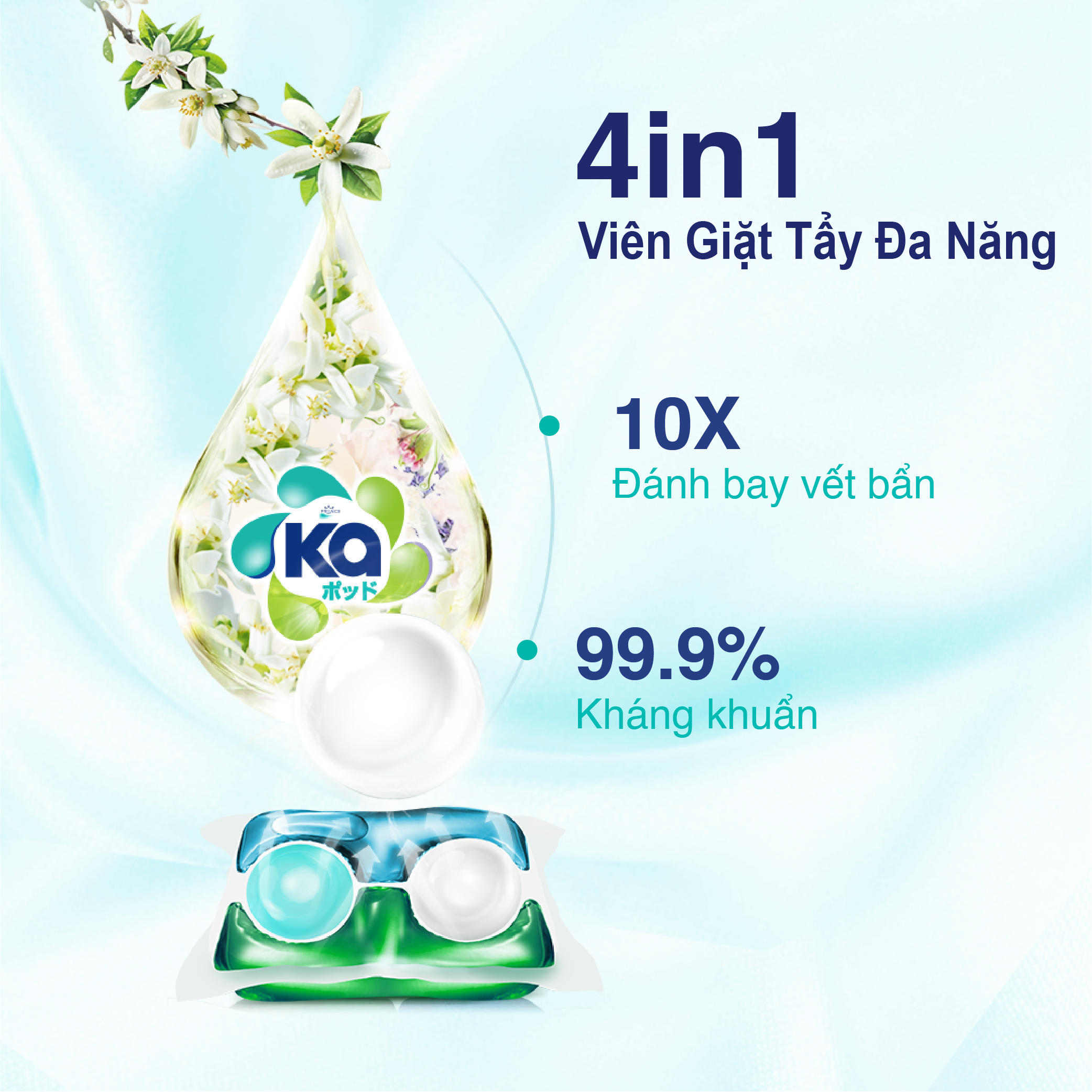 Không còn tình trạng rơi đổ lộn xộn và phải đong đếm bột giặt, việc giặt giũ sẽ tiện lợi hơn với Viên giặt đa năng Ka 4 trong 1. Với công thức siêu đậm đặc số 1 Nhật Bản, 1 viên giặt Ka dễ dàng hòa tan trong giặt và giặt 2.5-6kg quần áo. Chỉ cần một viên là tất cả những gì bạn cần để đồ giặt mềm hơn, sạch hơn và thơm tho hơn. 99,9% chống vi khuẩn Công suất làm sạch gấp 10 lần Làm mềm và sáng quần áo Tương thích cho máy giặt cửa trên và cửa trước Thích hợp cho sấy khô trong nhà Công thức Sud thấp Liều lượng khuyến nghị: 1 viên nang dùng cho lượng quần áo <7kg Cảnh báo: