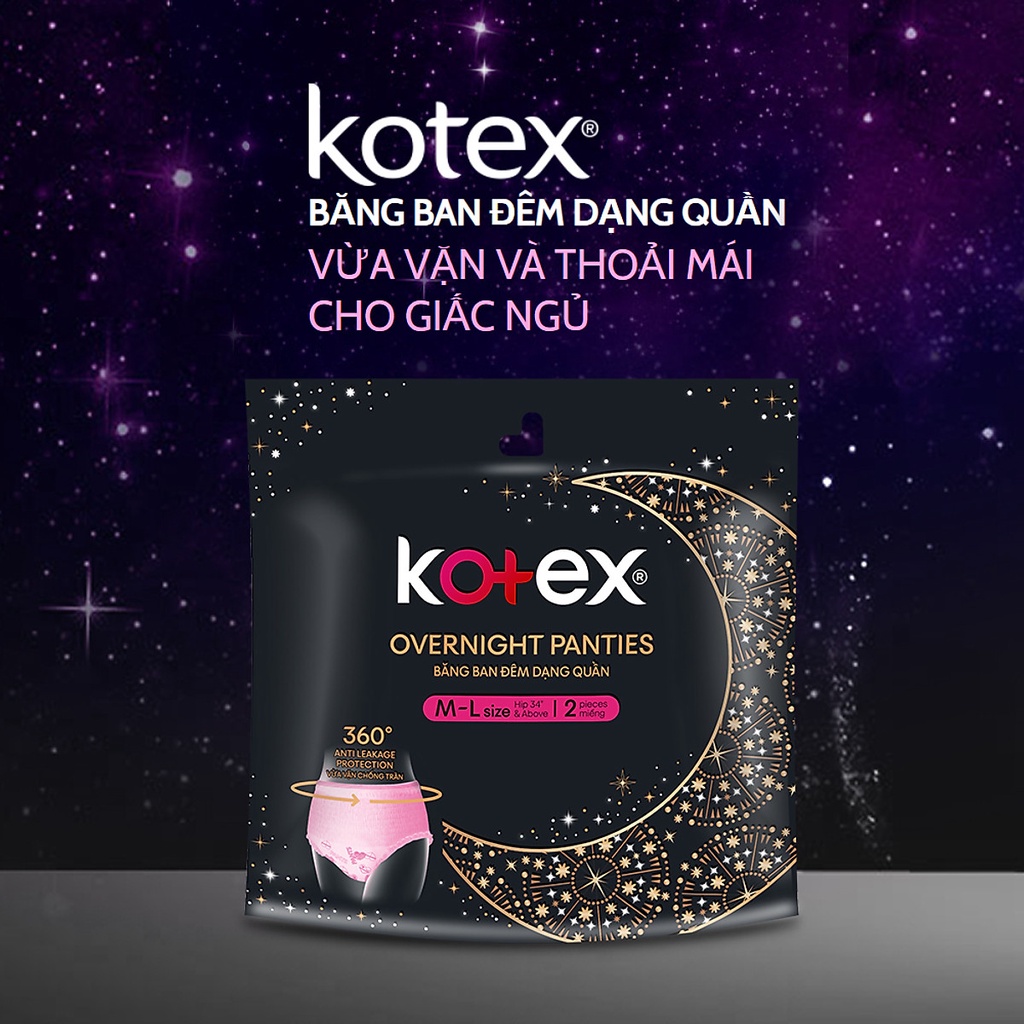 Kích thước phù hợp với nhiều dáng người: Hiện tại, Kotex ban đêm dạng quần đang được bày bán trên thị trường với 2 size thông dụng là M-L đảm bảo vừa vặn cho vòng eo 75cm và vòng mông lên đến 90cm.
