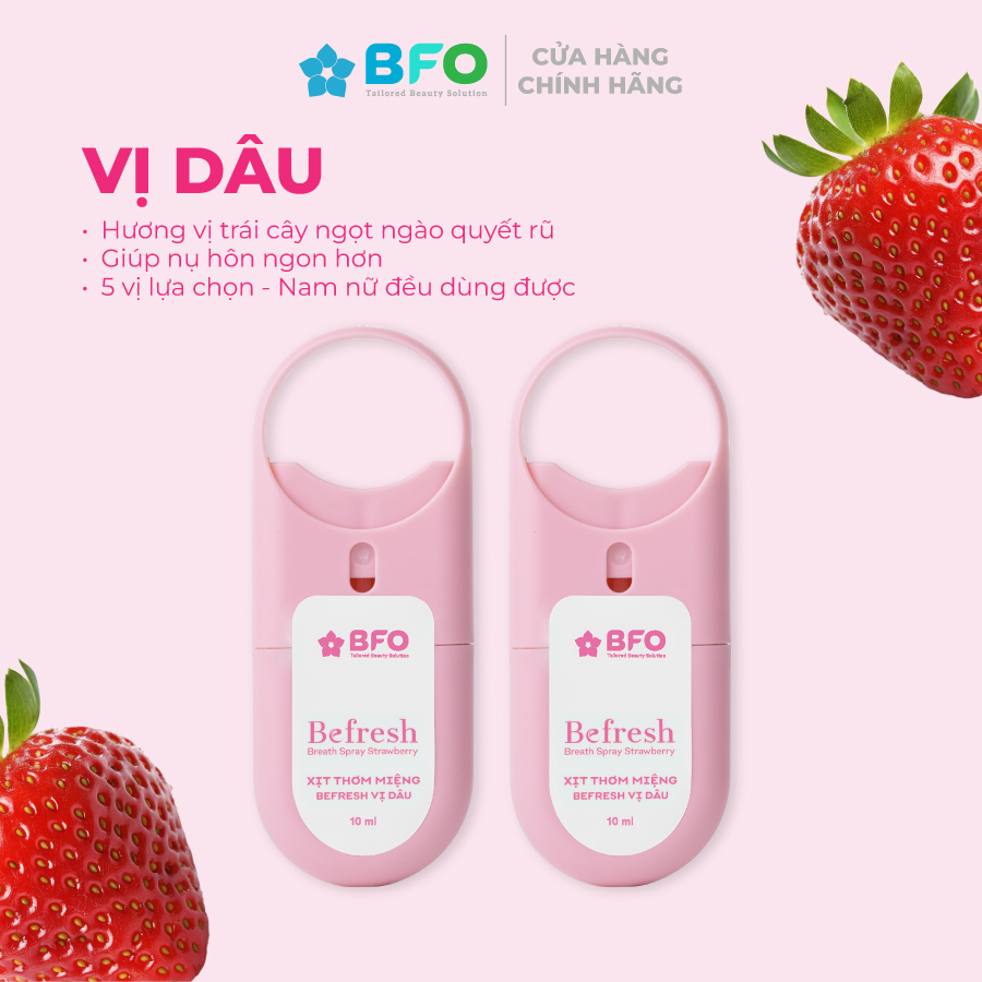Combo 4 Xịt Thơm Miệng Befresh Cho Hơi Thở Thơm Mát Chỉ Trong 3 Giây Dung Tích 10ml ƯU ĐIỂM NỔI BẬT Khử mùi hôi trong khoang miệng nhanh chóng chỉ trong 3 giây, giúp hơi thở thơm mát, sảng khoái. Chiết xuất từ tinh dầu trà xanh - bạc hà hoàn toàn thiên nhiên, cho hương thơm tự nhiên, không nồng, không khó chịu, an toàn khi nuốt. Thiết kế nhỏ gọn, tiện lợi, luôn sẵn sàng bên bạn trong bất kỳ cuộc hẹn nào. Sản phẩm không thể thay thế kem đánh răng và nước súc miệng, do đó bạn nên kết hợp đánh răng, súc miệng và xịt miệng để đảm bảo sức khỏe răng miệng và tự tin với khoang miệng sạch thơm suốt ngày dài.   THÀNH PHẦN   Tinh dầu bạc hà có công dụng khử mùi hôi, hỗ trợ làm sạch răng miệng. Tinh dầu trà xanh giúp ngăn ngừa sâu răng, hạn chế các vấn đề về nướu và chân răng. Vị the mát sảng khoái giúp giảm căng thẳng, tăng cường năng lượng, kích thích sự tập trung tinh thần.   MÙI HƯƠNG 4 LOẠI VỊ ĐÀO ️ VỊ DÂU BẠC HÀ TRÀ XANH - BẠC HÀ HƯỚNG DẪN BẢO QUẢN   Đậy nắp kín sau khi sử dụng. Bảo quản nơi khô ráo, thoáng mát. Tránh nhiệt độ cao. Tránh ánh nắng trực tiếp. Xuất xứ: Việt Nam   THÔNG TIN THƯƠNG HIỆU   Thương hiệu BFO: Tự hào là chuỗi cửa hàng cung cấp các sản phẩm chăm sóc và làm đẹp toàn diện, giá tốt, chất lượng độc tôn trên toàn Châu Á. Với niềm tin mãnh liệt trong từng sản phẩm tạo ra, BFO hy vọng mang lại những trải nghiệm tốt nhất cho người tiêu dùng: HIỆU QUẢ - TỐI GIẢN - THOẢI MÁI.