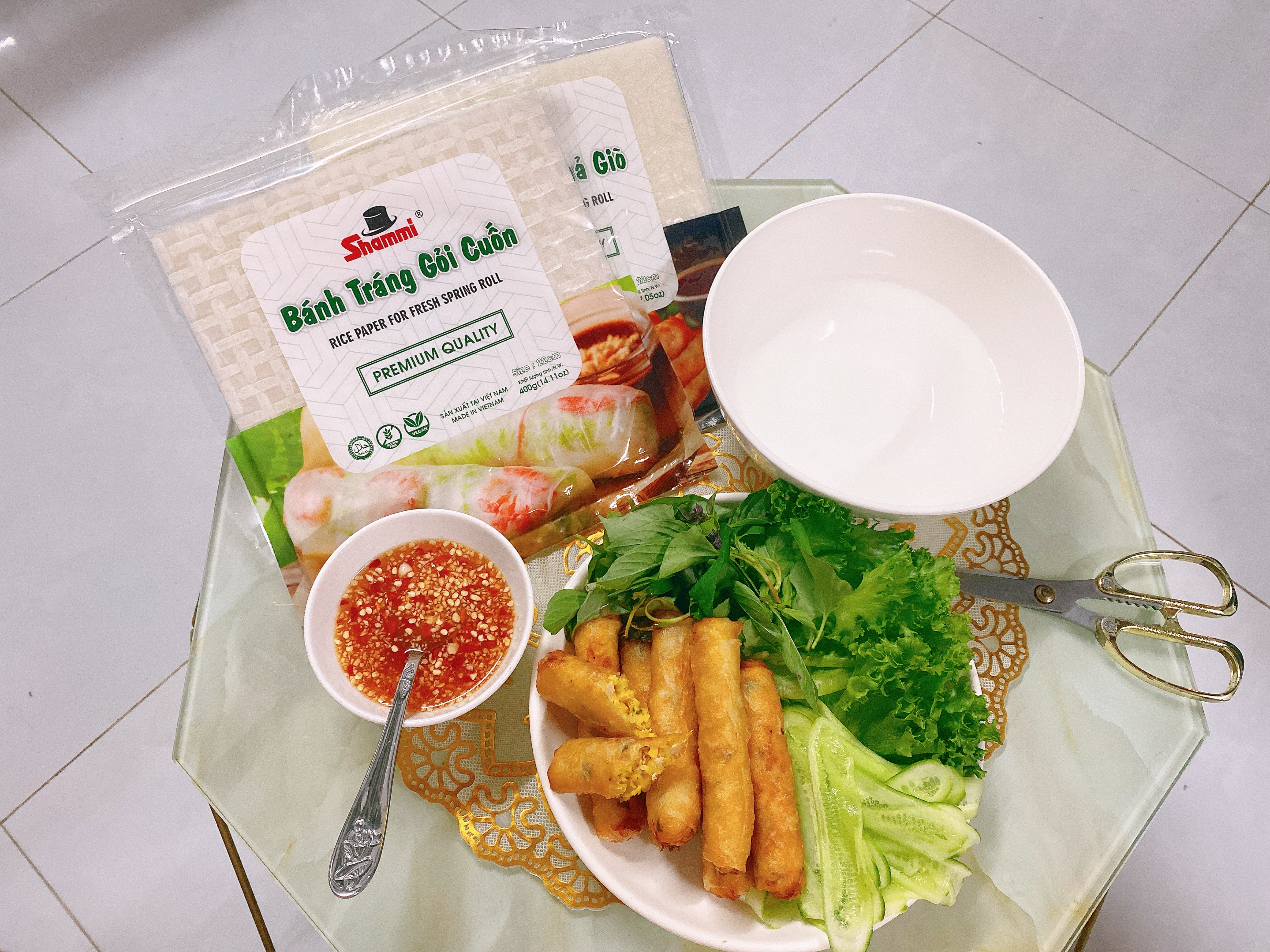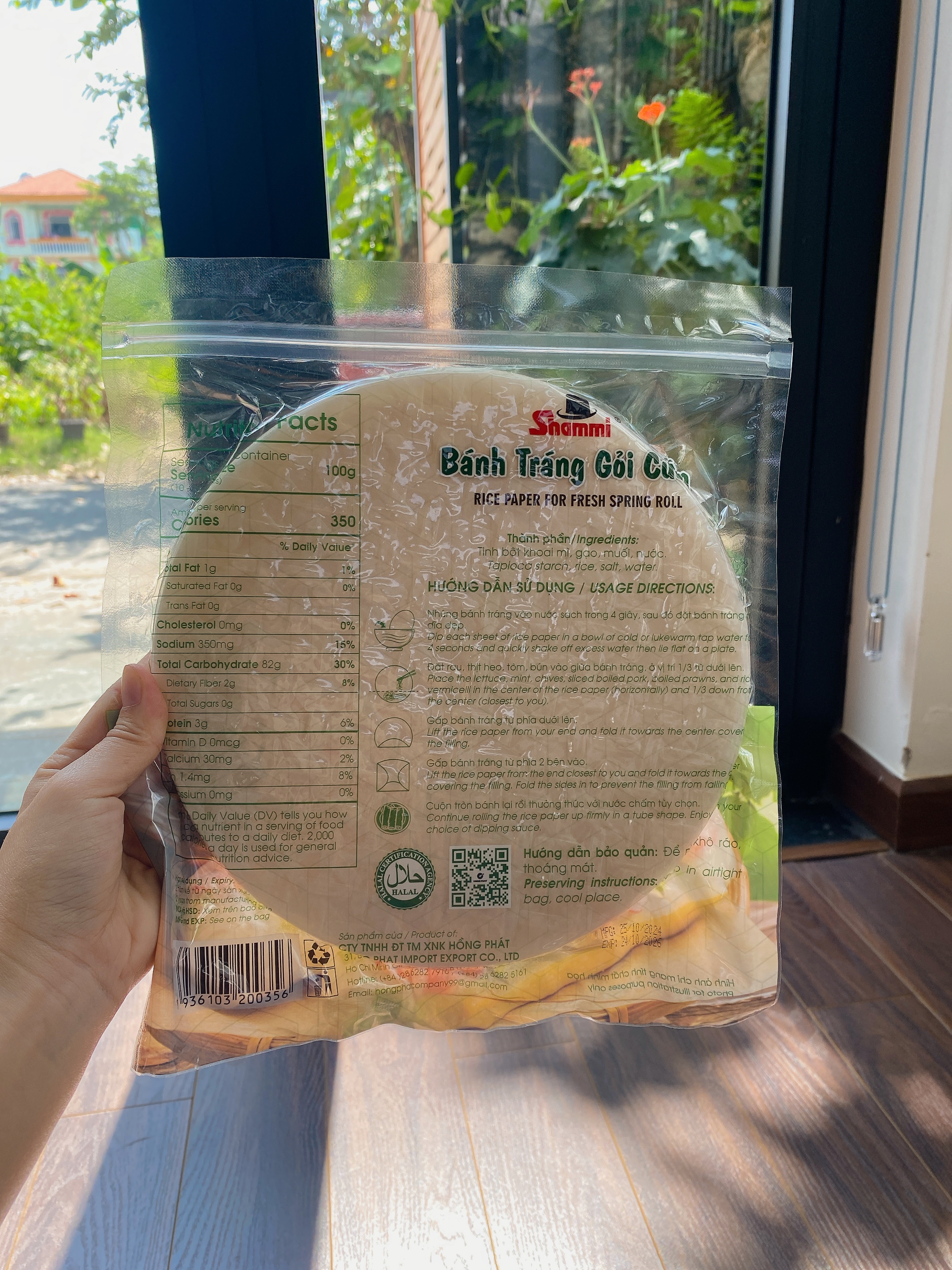 - KHÔNG gluten Sản phẩm đạt chứng chỉ HALAL, FSSC22000 có thể sử dụng được cả chay và mặn. Khối lượng: 400g Hạn sử dụng: 2 năm HƯỚNG DẪN SỬ DỤNG: 1/ Nhúng bánh tráng vào nước trong 4s, sau đó đặt bánh ra dĩa dẹp. 2/ Đặt rau, thịt, tôm hay topping bạn muốn vào giữa bánh, ở vị trí ⅓ từ dưới lên. 3/ Gấp bánh từ phía dưới lên. 4/ Gấp bánh từ phía 2 bên vào. 5/ Cuộn tròn bánh lại rồi thưởng thức với nước chấm tùy thích. THÀNH PHẦN DINH DƯỠNG (TRÊN 100G):