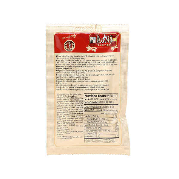 Xuất xứ Việt Nam Dung tích 350ml Hướng dẫn sử dụng Uống trực tiếp ngày 1 - 2 lần, mỗi lần 1 gói Thành phần Hồng sâm Hàn Quốc 6 năm tuổi, chiết xuất hỗn