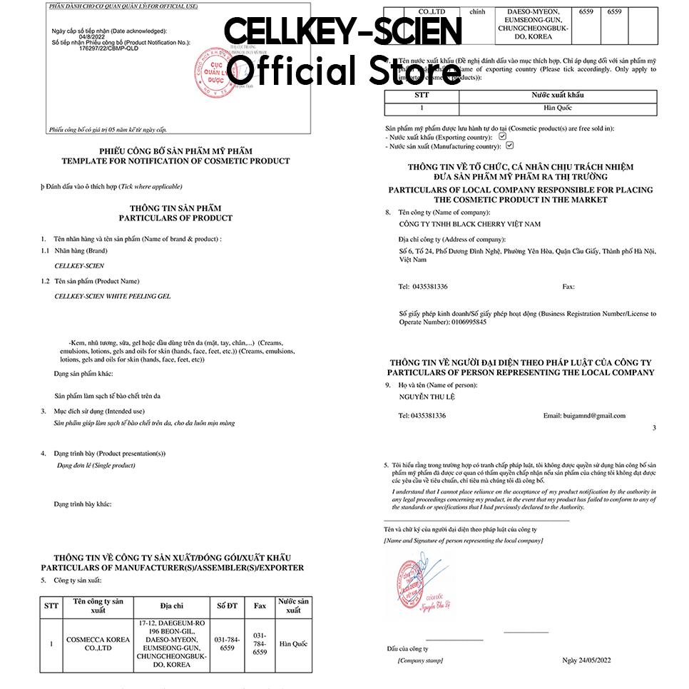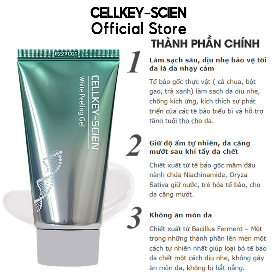 - Điểm đặc biệt là Cellkey-scien White Peeling Gel chỉ lấy đi lượng da chết trên da nên da chết sau khi được tẩy vẫn giữ màu trắng của da. HƯỚNG DẪ SỬ DỤNG: +Bước 1: Lấy 1 lượng Kem rửa mặt vừa phải ra lòng bàn tay rồi tạo bọt, sau đó massage nhẹ nhàng trên mặt chừng 30s rồi rửa lại bằng nước. +Bước 2: Sau khi rửa sạch mặt bằng Kem rửa mặt. Lau khô mặt và tay, lấy 1 lượng gel tẩy tế bào chết vừa đủ, massage đều trên bề mặt da khoảng 30~40s. Sau đó rửa lại bằng nước hơi âm ấm là xong. Rửa mặt sáng tối mỗi ngày, tuần chỉ tẩy da chết 2 lần. Lưu ý: Sau khi sử dụng đóng kín nắp sản phẩm, bảo quản nơi thoáng mát và tránh tiếp xúc trực tiếp với ánh nắng mặt trời. THÔNG TIN THƯƠNG HIỆU: Dòng sản phẩm tế bào gốc thực vật CELLKEY-SCIEN được tập đoàn COSMECCA (Một trong ba tập đoàn sản xuất mỹ phẩm lớn nhất tại Hàn Quốc) nghiên cứu và sản xuất. Tại Việt Nam, Công ty TNHH BLACK CHERRY VIỆT NAM là đơn vị nhập khẩu và phân phối duy nhất. Đặc biệt dòng sản phẩm tế bào gốc thực vật Cellkey-Scien này đã được cấp Giấy chứng nhận bảo hộ thương hiệu. Xuất xứ thương hiệu: Hàn Quốc Nơi sản xuất: Hàn Quốc Dung tích: