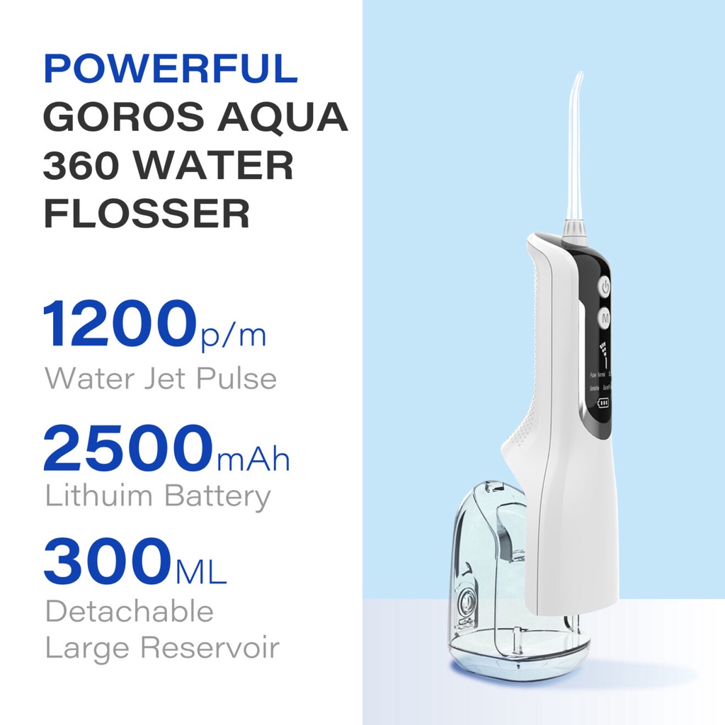 - Màn hình LCD hiện thị thông minh -Công nghê HydroPulse kết hợp giữa áp lực nước và nhịp phun phù hợp. THÔNG TIN CHI TIẾT SẢN PHẨM: Tên sản phẩm: Máy tăm nước Goros Aqua360 Thương hiệu: GOROS Màu sắc: Trắng, Đen Dung lượng pin: 2200 mAh Dung tích ngăn chứa nước: 330 ml Thời gian sạc: 3-4 h Áp lực nước định mức: 30 -90 psi Điều chỉnh bánh răng: 5 chế độ làm sạch Lớp chống nước: IPx7 BẢNG KÊ HÀNG HÓA: 1 Máy tăm nước Đầu làm sạch 4 1 Loại – C Dây sạc 1 Hướng dẫn sử dụng