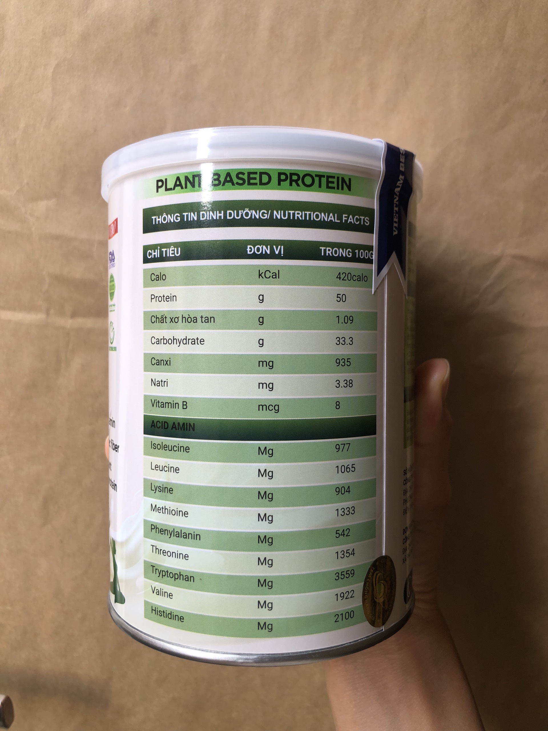 - Thành phần: Protein từ đậu nành, đậu hà lan, yến mạch, hạt chia, tinh bột ngô, vitamin B, canxi, natri, acid amin, khoáng chất và bột ca cao