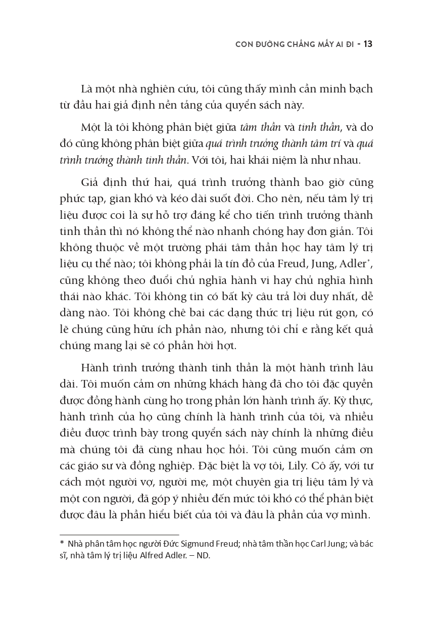 Con Đường Chẳng Mấy Ai Đi là một cuốn sách viết về chủ để Tâm lý, Các tổn thương tâm lý, Tình yêu và Hành trình trưởng thành tinh thần. Cuốn sách cung cấp những công cụ và giải pháp an toàn, thực tiễn và dễ dàng thực hiện, giúp bạn đọc hướng đến một cuộc đời hạnh phúc. Thông qua quá trình trị các bệnh nhân cũng như những trải nghiệm bản thân, tác giả cuốn sách – bác sĩ tâm lý M. Scott Peck, cho chúng ta thấy rằng để có được một cuộc đời hạnh phúc nhất thiết phải đạt được sự trưởng thành về tinh thần. Đây tuy là lối tắt, nhưng lại Con Đường Chẳng Mấy Ai Đi. Cuốn sách này được chia thành bốn phần: Kỷ luật, Tình yêu, Trưởng thành & Tôn giáo và Phước lành.