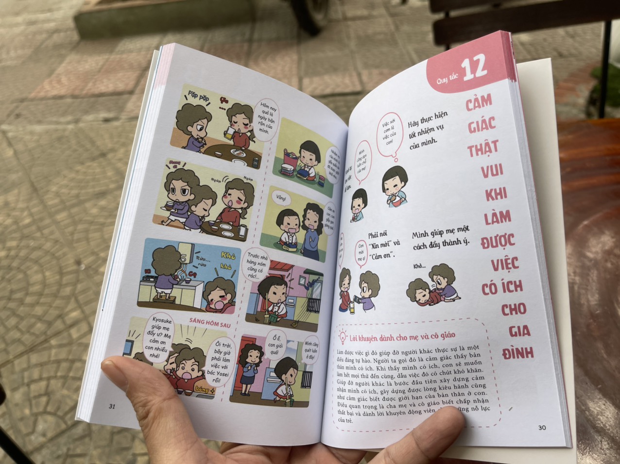 Những nội dung như “đi ngủ sớm – dậy sớm – ăn sáng”, “cách tiếp xúc với phương tiện truyền thông” được chuyển thể thành cuốn sách sử dụng các mẩu truyện tranh bốn ô.