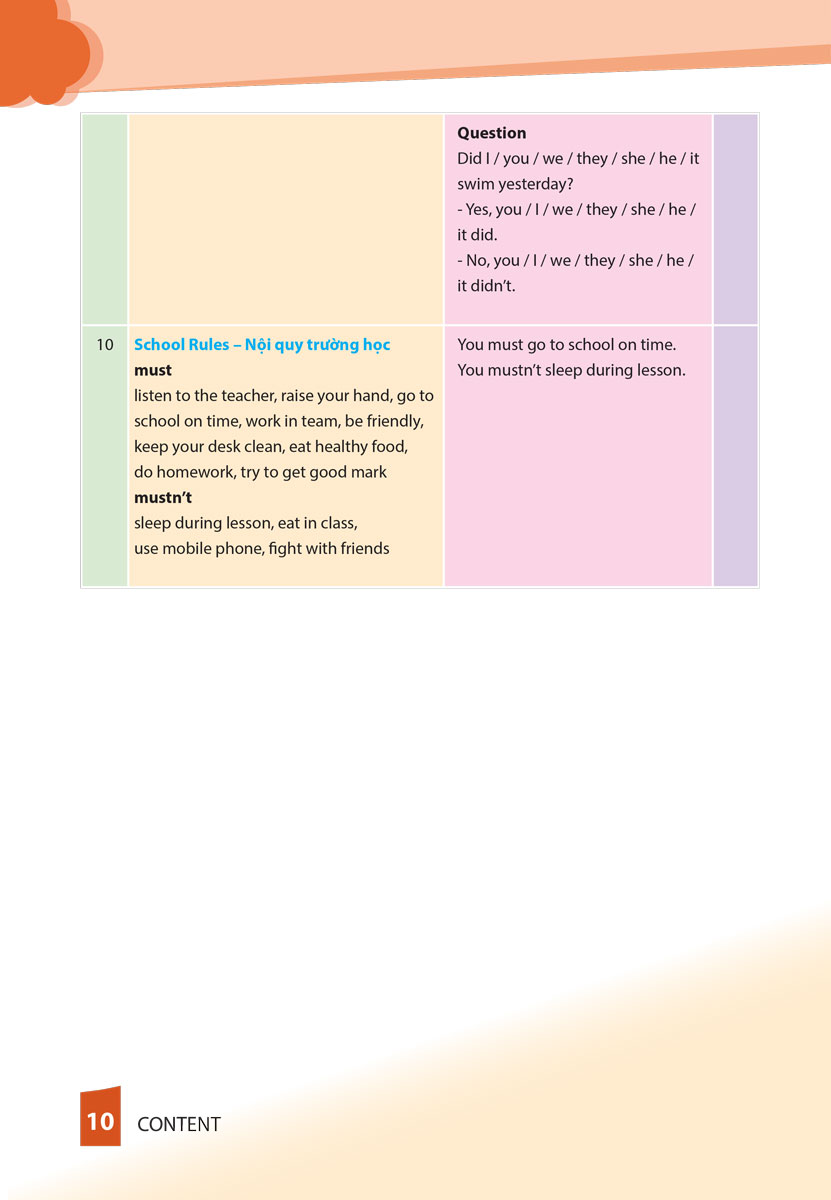 Nội dung chương trình bao gồm các chủ đề Hoạt động hàng ngày – Trạng từ tần suất – Nông trang – Nghề nghiệp – Các bệnh thường gặp – Các môn học – Nơi chốn – Quá khứ đơn/Động từ có quy tắc; bất quy tắc – Nội quy trường học.