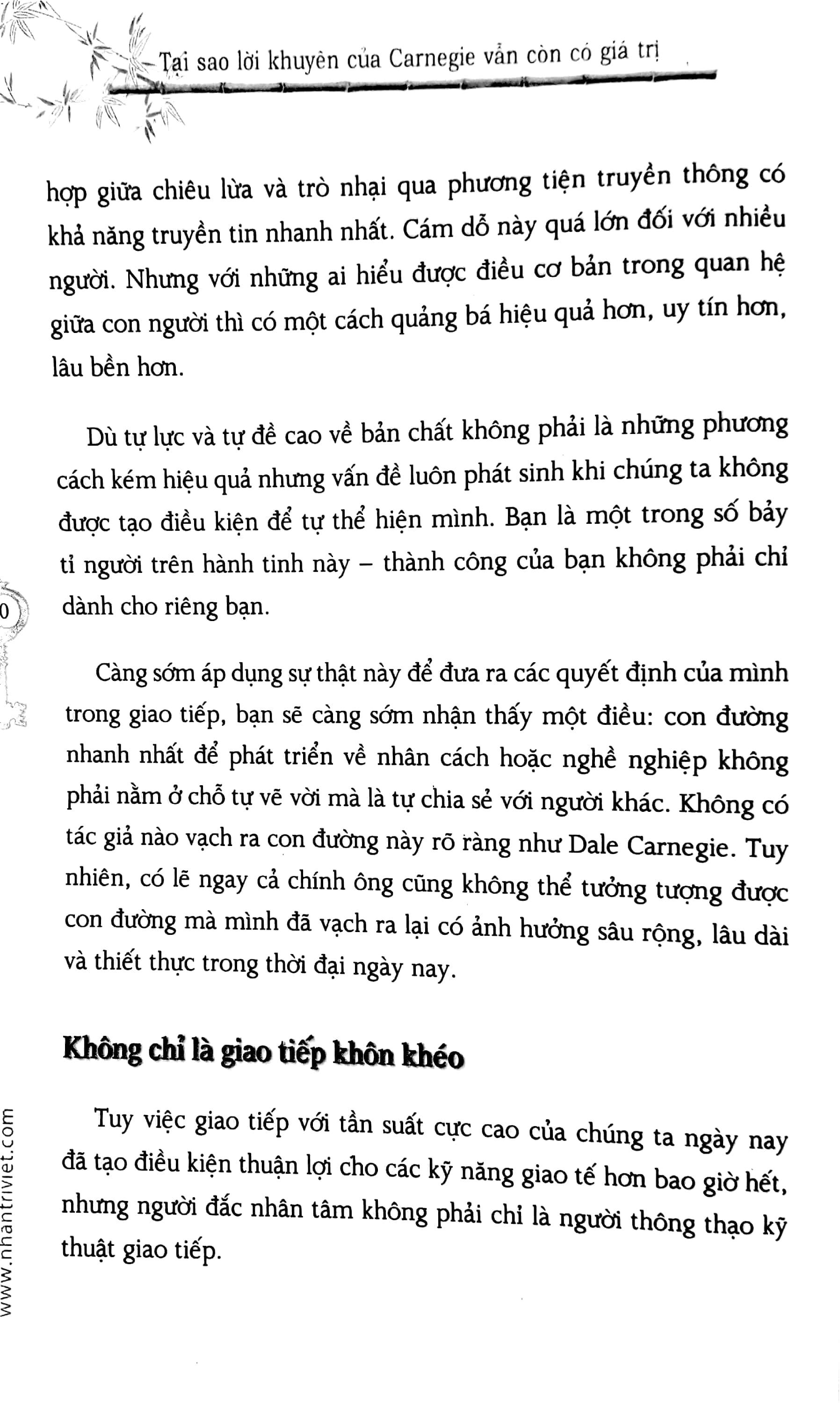 Những nguyên tắc mà Carnegie đưa ra để có sự thành công trong công việc cũng như trong giao tiếp vẫn luôn tồn tại với thời gian. Được minh họa bằng các câu chuyện dễ hiểu, lời khuyên của ông chứa đựng một thông điệp thậm chí còn rõ ràng hơn nữa trong thời đại ngày nay: “Quả đúng là thế giới ngày nay đang rộng mở cho các cơ hội giao thương, nhưng nhiệm vụ mà bạn phải làm trước tiên vẫn là những việc liên quan đến con người. Nỗ lực cao nhất vẫn luôn là nỗ lực cộng tác và tương tác. Cuối cùng thì nghệ thuật đắc nhân tâm trong thời đại số chính là sự kết nối và duy trì các mối quan hệ dựa trên lợi ích chung của các bên”., công ty Dale Carnegie và cộng sự đã biên soạn lại và bổ sung nội dung cho cuốn sách kinh điển này để hướng đến thế kỷ 21, đồng thời giữ lại các giá trị nền tảng của nó - những giá trị giúp chúng ta đạt đến sự thành công.