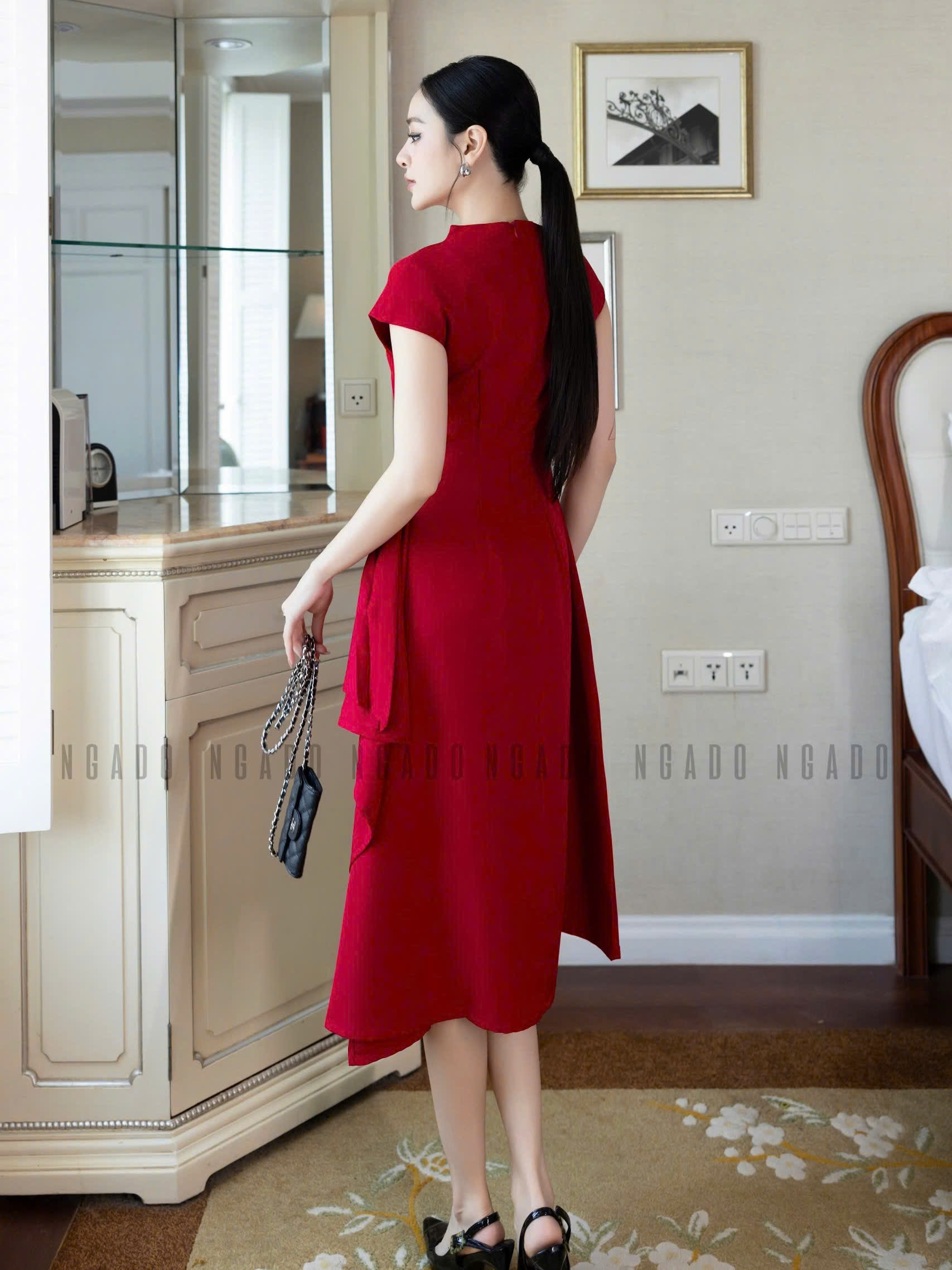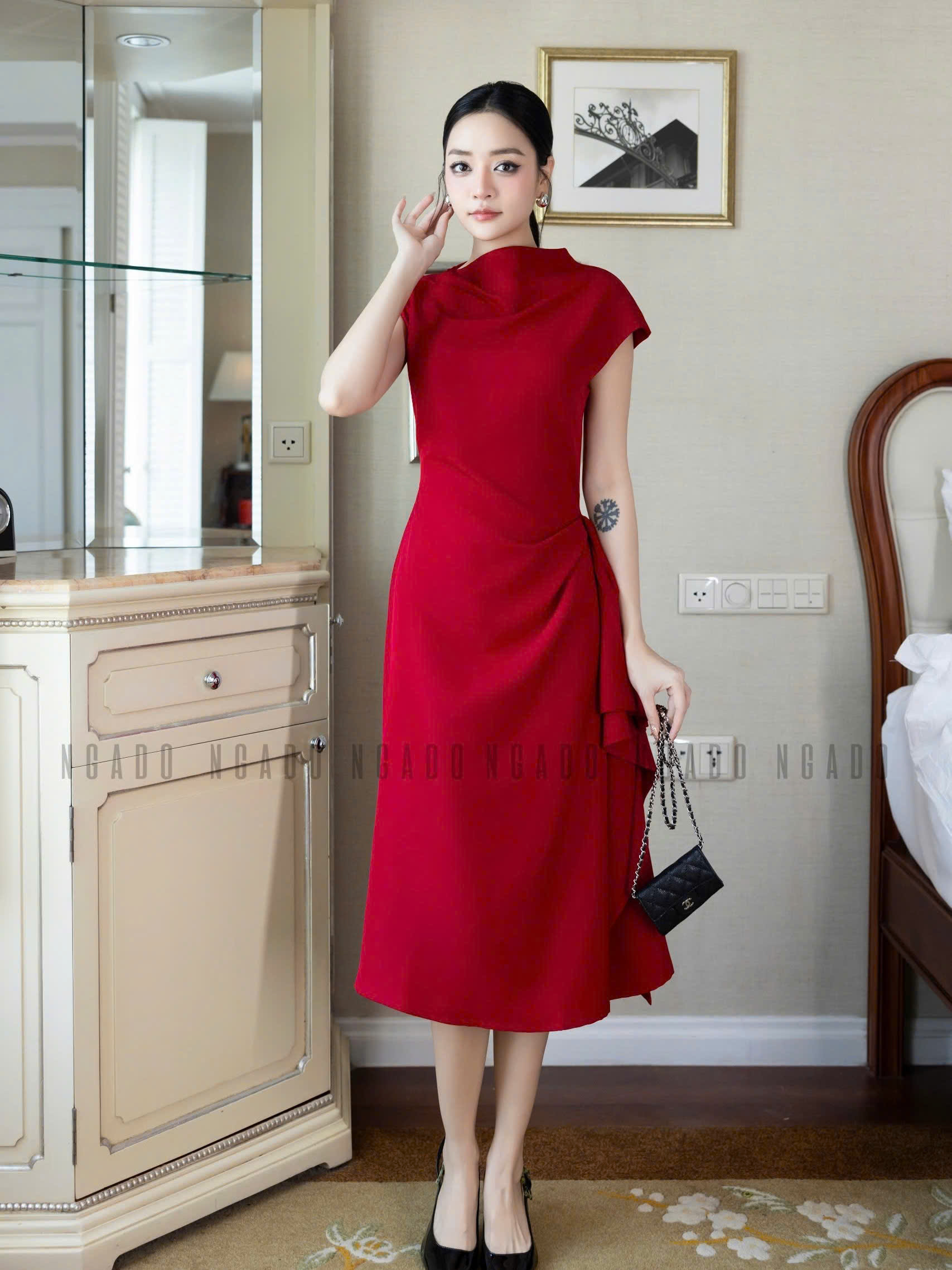 ✨Đầm đỏ cổ cao vạt xéo NGADO