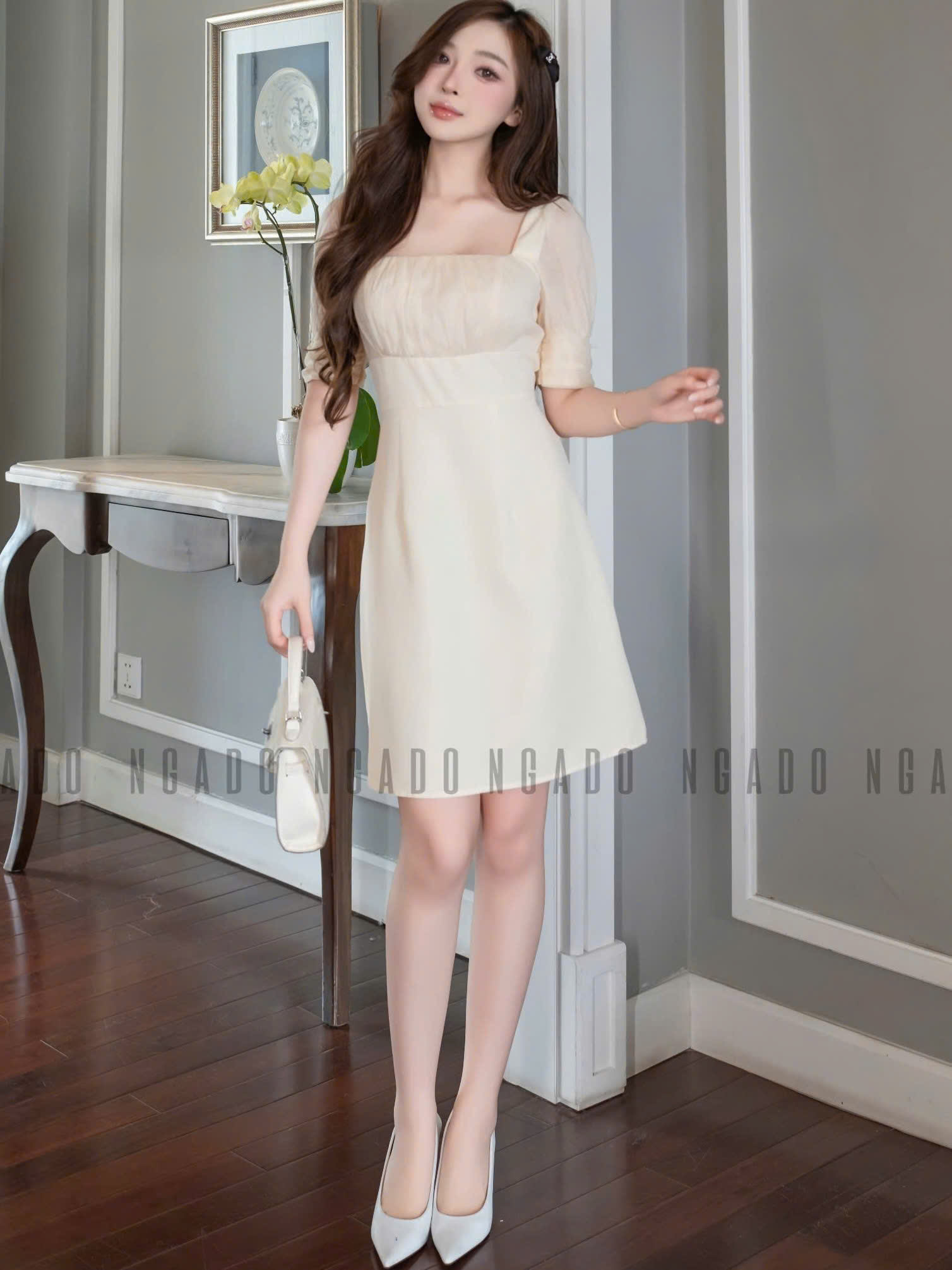 ✨Đầm kem cổ vuông phối voan NGADO , đầm kiểu Nữ , đầm voan