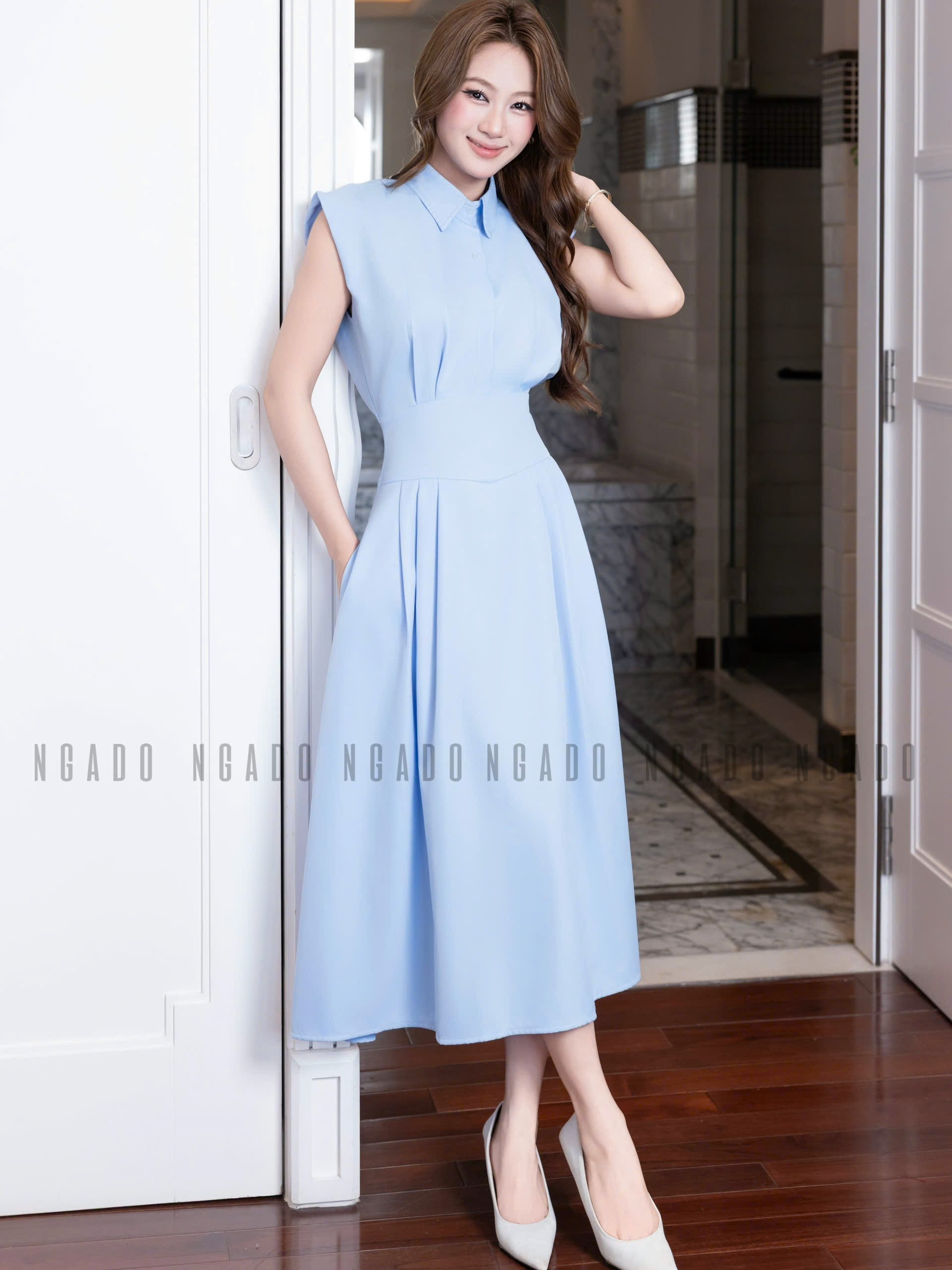 ✨Đầm sơ mi xanh biển xếp ly NGADO , đầm dáng dài , đầm kiểu , đầm sơ mi