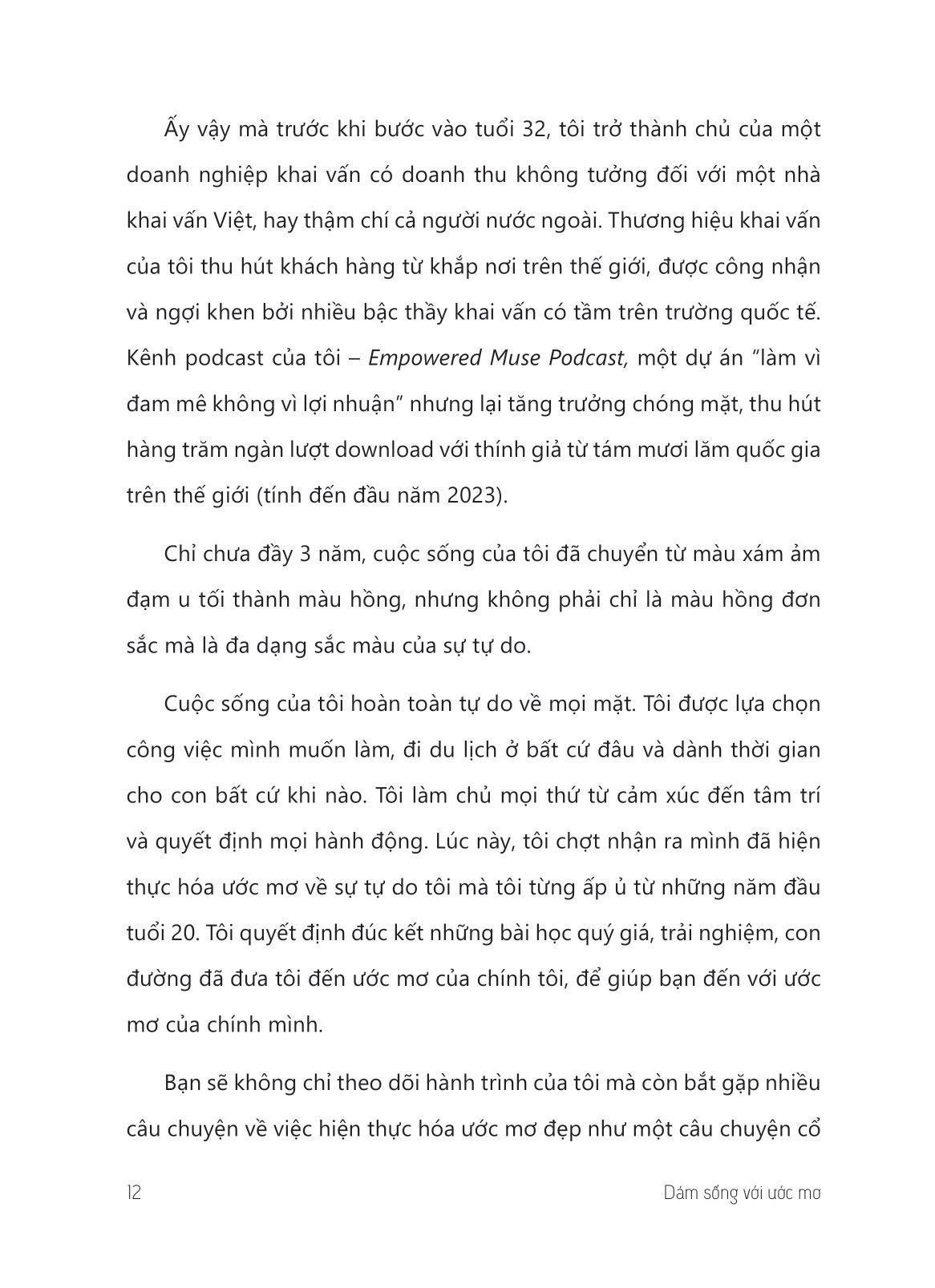Dám Sống Với Ước Mơ Khi bạn cầm cuốn sách này trên tay thì đó là dấu hiệu đã đến lúc bạn cần nghiêm túc xem xét lại về những gì m.ình luôn thầm ao ước: sự tự do, sự nghiệp, tiền bạc, tình yêu, thời gian, hạnh phúc gia đình hay bất cứ khía cạnh nào khác. Dám sống với ước mơ không phải là một cuốn sách truyền động lực đơn thuần mà là một cuốn sách “hướng dẫn sử dụng cuộc đời”song hành dài hạn cùng bạn. Những công cụ trong sách đều đơn giản và tinh gọn, để ngay cả những người phụ nữ đã có gia đình với nhiều mối bận tâm vẫn có thể thực hành chạm tới những ước mơ đầu tiên và cả những ước mơ lớn hơn sau đó – thậm chí là những ước mơ bạn chưa từng tưởng tượng ra!