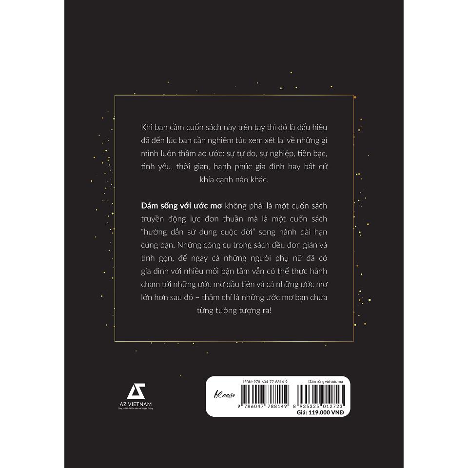 - * Giới thiệu sách: Khi bạn cầm cuốn sách này trên tay thì đó là dấu hiệu đã đến lúc bạn cần nghiêm túc xem xét lại về những gì mình luôn thầm ao ước: sự tự do, sự nghiệp, tiền bạc, tình yêu, thời gian, hạnh phúc gia đình hay bất cứ khía cạnh nào khác. Dám sống với ước mơ không phải là một cuốn sách truyền động lực đơn thuần mà là một cuốn sách “hướng dẫn sử dụng cuộc đời” song hành dài hạn cùng bạn. Những công cụ trong sách đều đơn giản và tinh gọn, để ngay cả những người phụ nữ đã có gia đình với nhiều mối bận tâm vẫn có thể thực hành chạm tới những ước mơ đầu tiên và cả những ước mơ lớn hơn sau đó – thậm chí là những ước mơ bạn chưa từng tưởng tượng ra!