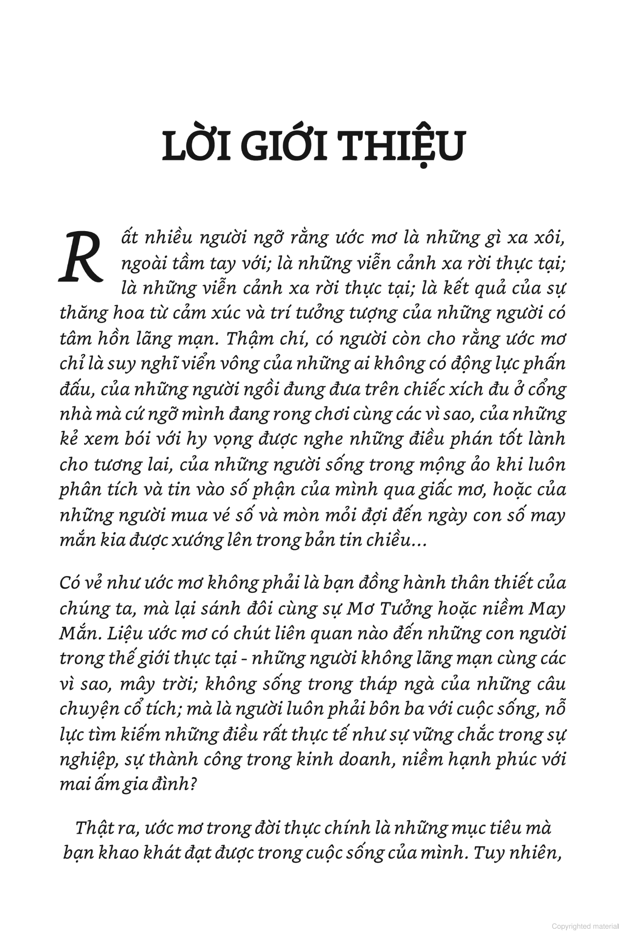 Hy vọng với cuốn sách này, những ai chưa từng ước mơ sẽ nhanh chóng tìm thấy ước mơ của riêng m.ình; những ai đang nuôi dưỡng ước mơ sẽ củng cố thêm quyết tâm để biến ước mơ trở thành hiện thực; và những ai đã hoàn thành, đã chinh phục được ước mơ của m.ình sẽ tiếp tục cuộc hành trình tìm kiếm một ước mơ mới.
