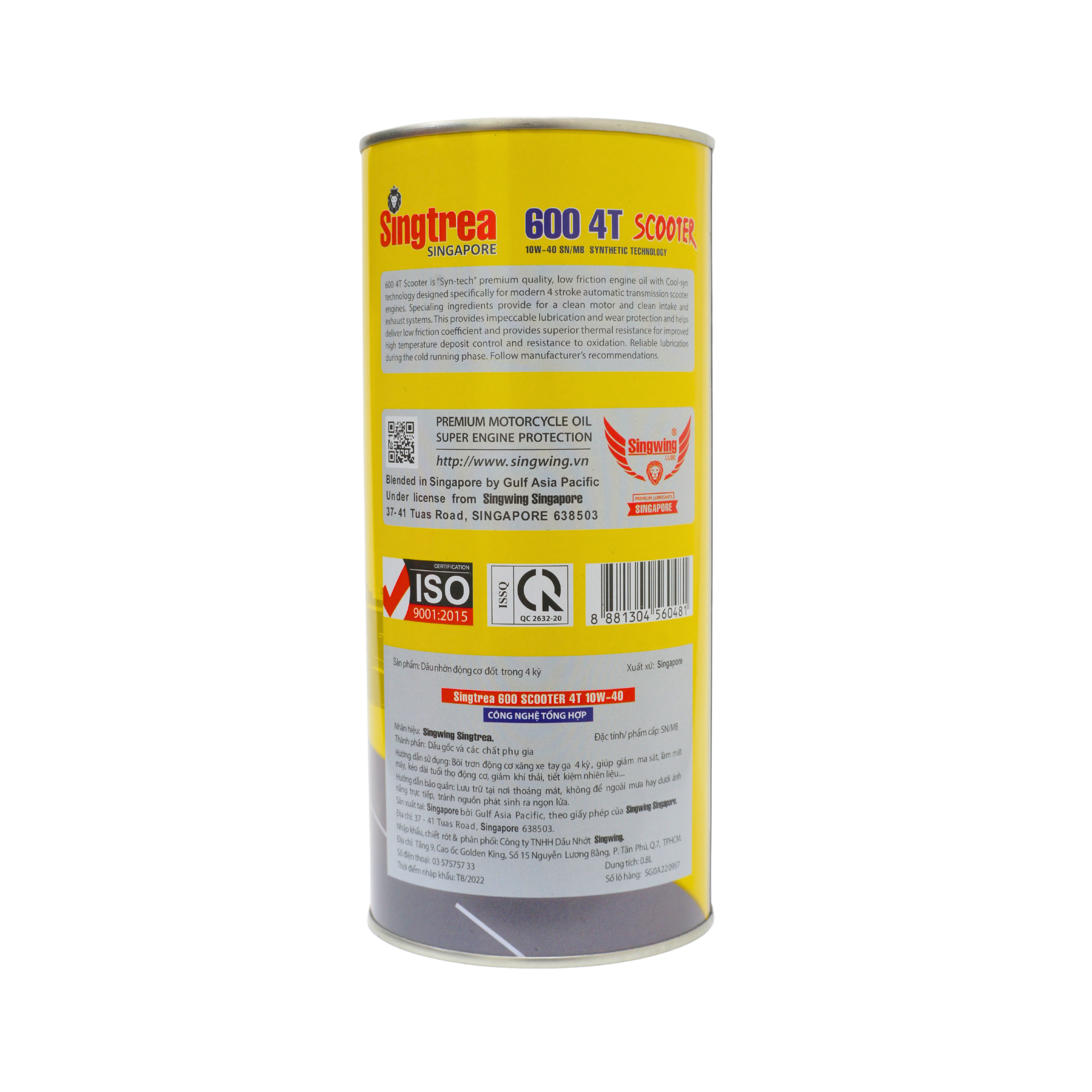 - Dầu nhớt xe máy Singtrea 600 4T Scooter là sản phẩm dầu động cơ công nghệ tổng hợp hiệu suất cao dùng cho xe tay ga tham gia giao thông trong thành phố, phù hợp với tất cả các loại xe tay ga hộp số tự động 4 thì hiện đại.