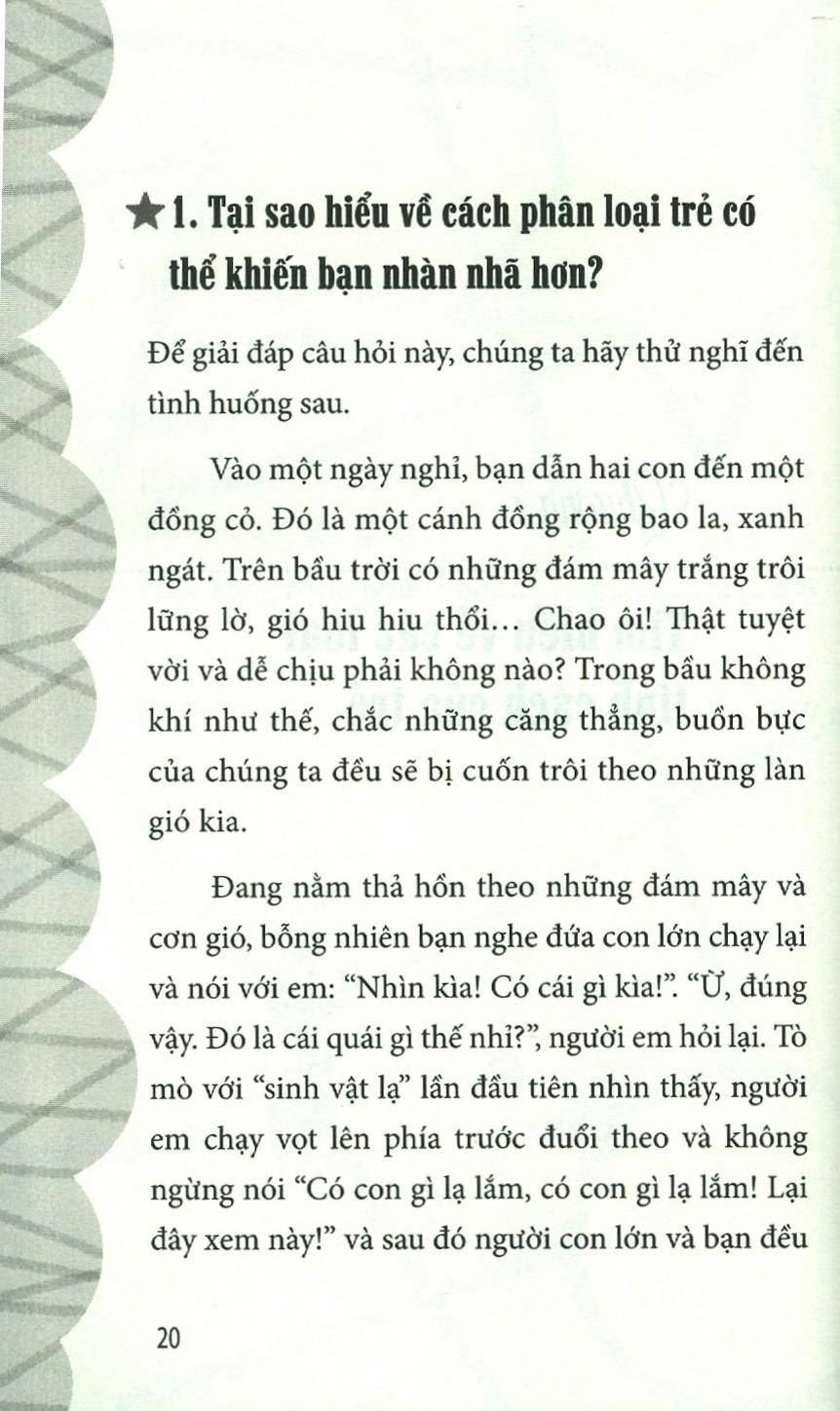 Mỗi đứa trẻ là một bài toán đố mà chúng ta phải đi tìm câu trả lời. Với phương pháp “hiểu cách phân loại trẻ” được trình bày cụ thể trong cuốn sách này,chúng tôi hy vọng rằng các bậc phụ huynh sẽ tìm được phương pháp phù hợp trong quá trình nuôi dạy con cái và hãy áp dụng nó như một “chiến thuật” hợp lí.