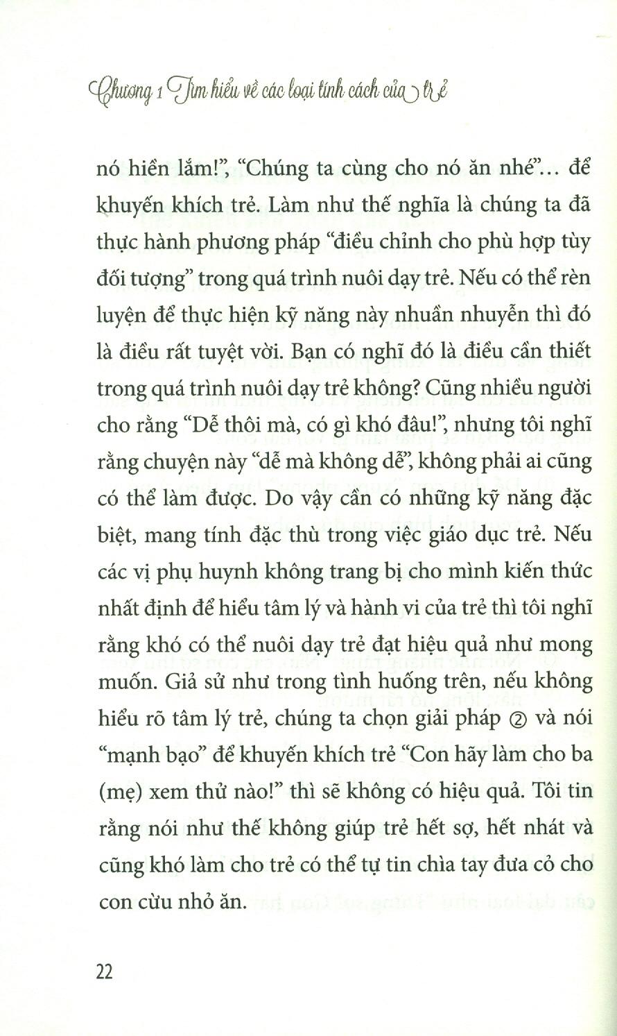 Bạn có từng cảm thấy như vậy không? Mặc dù đứa trẻ nào cũng đều chui ra từ bụng mẹ nhưng mỗi đứa lại có một tính cách khác nhau. Đứa thì ít nói, đứa thì y như trẻ con hay nhõng nhẽo, đứa thì nghiêm trang, chín chắn như người lớn… Đứa thì đi đâu cũng lẽo đẽo theo m.ình, đứa thì nghịch ngợm, đi đâu cũng tự m.ình đi… Chắc cũng có lúc bạn cảm thấy khó hiểu và thích ứng với bọn trẻ. Nếu bạn có những vấn đề như đã đề cập thì đừng lo lắng. Chúng ta có thể giải quyết những điều đó qua những thông tin được chia sẻ trong cuốn sách này.