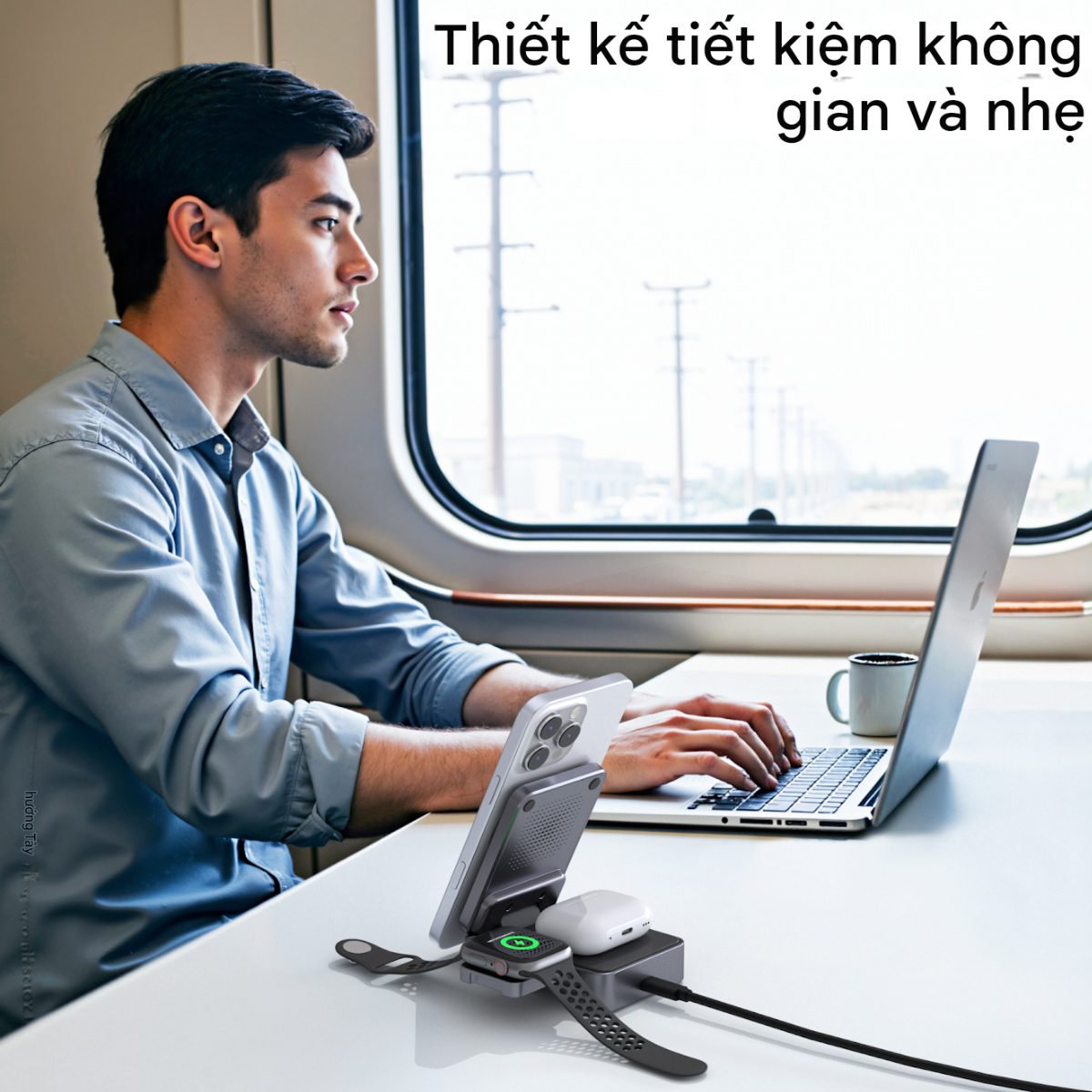 - Sạc 3 trong 1 sạc cùng lúc iP, Ap Watch, AirP tiện lợi - Công nghệ Qi2 MagS tương thích iP 12, 13, 14, 15 sạc nhanh hơn - Sạc không dây 15W tối ưu tốc độ sạc an toàn, hiệu quả - Thiết kế nam châm mạnh hít chặt, giữ thiết bị cố định chắc chắn - Gập gọn siêu di động dễ dàng mang theo, tiện lợi khi di chuyển