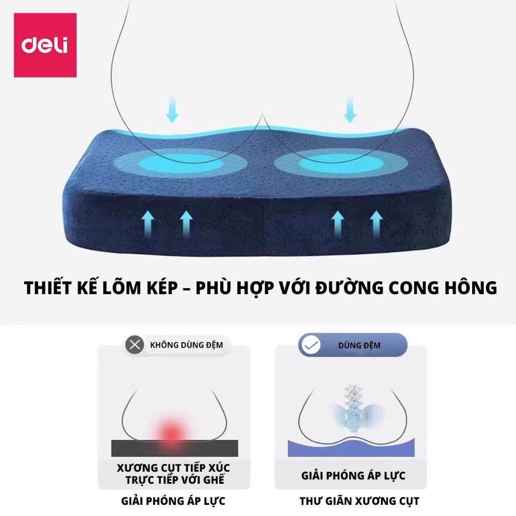 THÔNG TIN SẢN PHẨM Tên sản phẩm: Đệm ngồi Deli nệm lót ghế cao su non siêu đàn hồi chống trĩ chống đau ê mông êm ái giúp ngồi thoải mái cả ngày tiện dụng Kích thước: 40040055mmĐẶC ĐIỂM SẢN PHẨM Chất liệu cao su non cao cấp – Đàn hồi tốt, êm ái, giúp nâng đỡ và giảm áp lực khi ngồi lâu. Hỗ trợ chống trĩ & giảm đau mỏi – Thiết kế tối ưu giúp hạn chế tình trạng tê mỏi, đau xương cat, phù hợp cho người ngồi lâu. Vỏ bọc mềm mại, thoáng khí – Không gây bí nóng, mang lại cảm giác dễ chịu suốt cả ngày. Thiết kế tiện lợi & đa năng – Dùng được cho dân văn phòng, tài xế, học sinh, người lớn tuổi, bà bầu... Dễ vệ sinh – Có khóa kéo tiện lợi, dễ dàng tháo vỏ để giặt sạch. Ứng dụng linh hoạt – Thích hợp sử dụng trên ghế văn phòng, ghế xe hơi, ghế ngồi học tập hoặc thư giãn. Deli Home Living sẽ mang cho bạn một trong những trải nghiệm về tiện ích đời sống hàng ngày. Với phương châm sản xuất những sản phẩm chất lượng tốt nhất và luôn đặt khách hàng làm trọng tâm, sứ mệnh của Deli là làm hài hòng người tiêu dùng toàn cầu với những sản phẩm chất lượng cao, độ tin cậy tuyệt đối và thân thiện với người dùng. Khách hàng lựa chọn các sản phẩm của Deli_homeliving sẽ được cam kết: