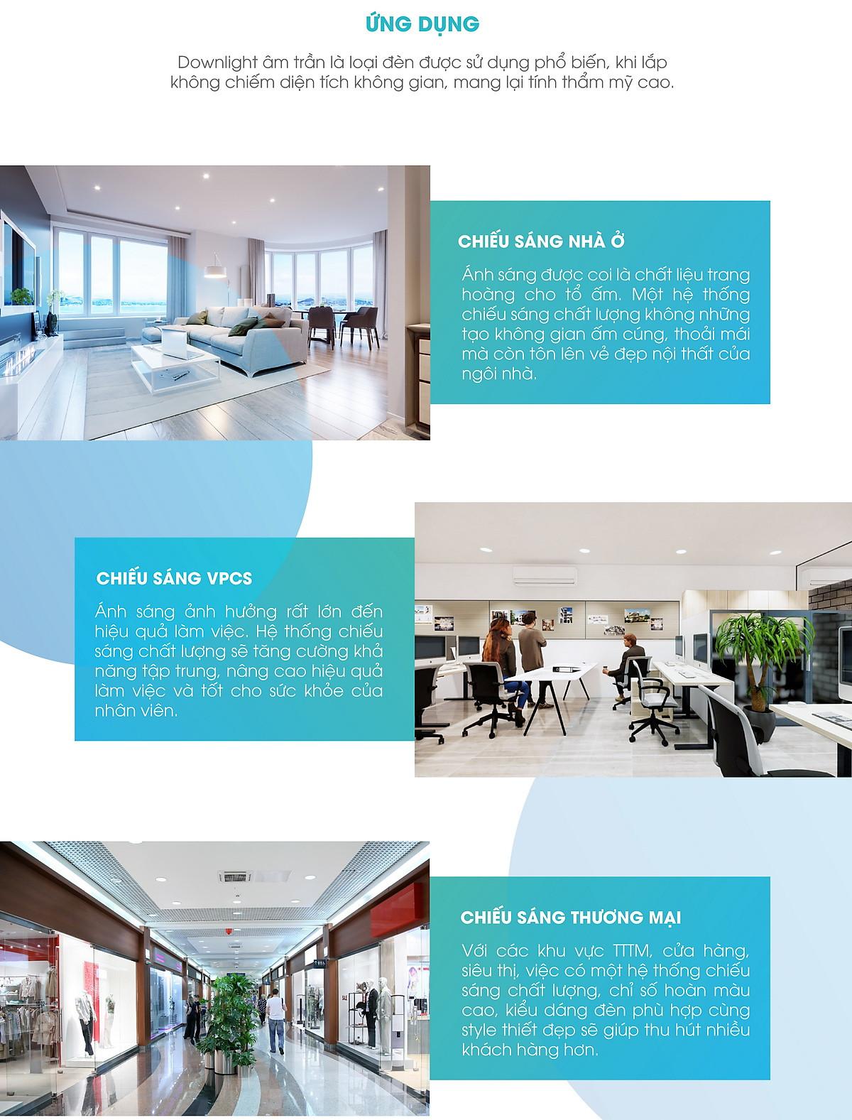 Đèn LED âm trần downlight sử dụng chip led samsung có hiệu suất chiếu sáng 150lm/W, tiết kiệm 75% điện năng thay thế đèn downlight halogen 35w, Ánh sáng đồng đều, không gây chói mắt,