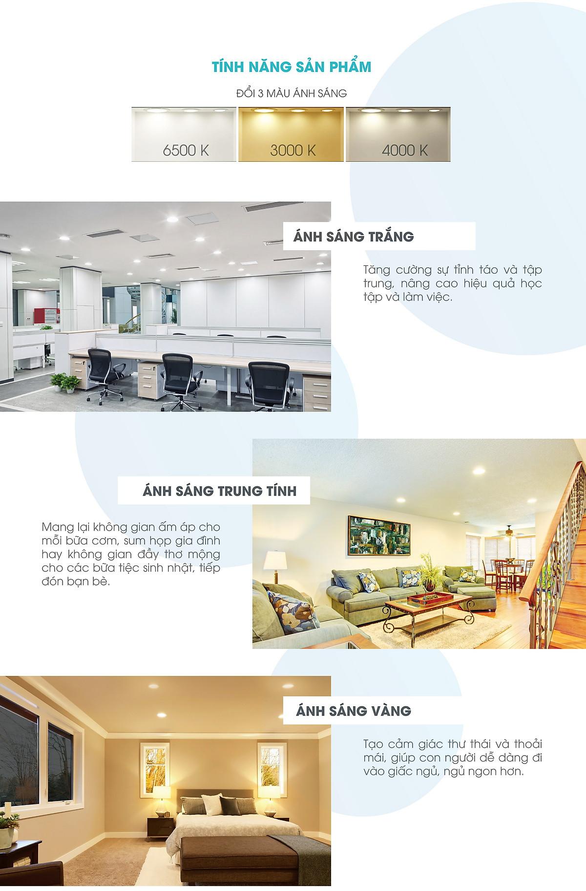 Công suất: 12W Điện áp: 220V/50Hz Quang thông: 930lm/910lm Nhiệt độ màu: 6500K/3000K Kích thước (ØxH): (138x50)mm ĐK lỗ khoét trần: 110mm - Sử dụng Chip LED Samsung đạt độ tin cậy cao - Chất