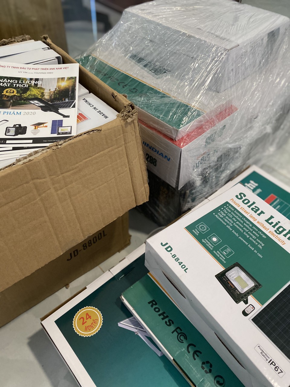 ĐÈN LED SOLAR LIGHT 40W - JD8840L • Kích thước: 25.5 × 22 × 6 cm • Công suất: 40w • Số lượng chip: 110 Chip Led • Tính năng: Cảm biến ánh sáng, Điều khiển từ xa, Hiển thị % Pin • Đèn tích hợp ren cao su, nẹp bắt vít 4 cạnh dễ dàng thay thế linh kiện • THỜI GIAN SẠC: 4-6h • CHỐNG NƯỚC: IP67, thoải mái lắp đặt ngoài trời • Chất liệu tấm pin : Poly tuổi thọ 10-12 năm • TUỔI THỌ ĐÈN 50.000 h • THÂN ĐÈN: Nhôm đúc nguyên khối, phay rãnh tản nhiệt; tích hợp đèn báo tình trạng pin độ chính xác cao • Đèn LED: Chíp led SMD 5730 công suất cao • Điều khiển: Khoảng cách 6-15m, chế độ auto, hẹn 3h / 5h ON/ OFF • Bộ SP Gồm: Đèn + Khung gắn chữ U + Điều khiển