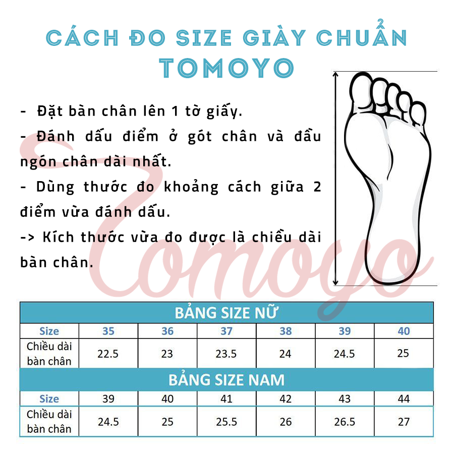 - Lưu ý Bảo Quản: Để giữ gìn đôi dép của bạn, hãy lau khô sau khi đi mưa và bảo quản ở nơi khô ráo, tránh ánh nắng mặt trời trực tiếp. Về Thương Hiệu TOMOYO: TOMOYO - thương hiệu thời trang Việt cao cấp, nơi chất lượng sản phẩm và dịch vụ khách hàng luôn được đặt lên hàng đầu. Chúng tôi tự hào mang đến cho bạn những sản phẩm tốt nhất với cam kết “Đồng hành cùng chất lượng”.