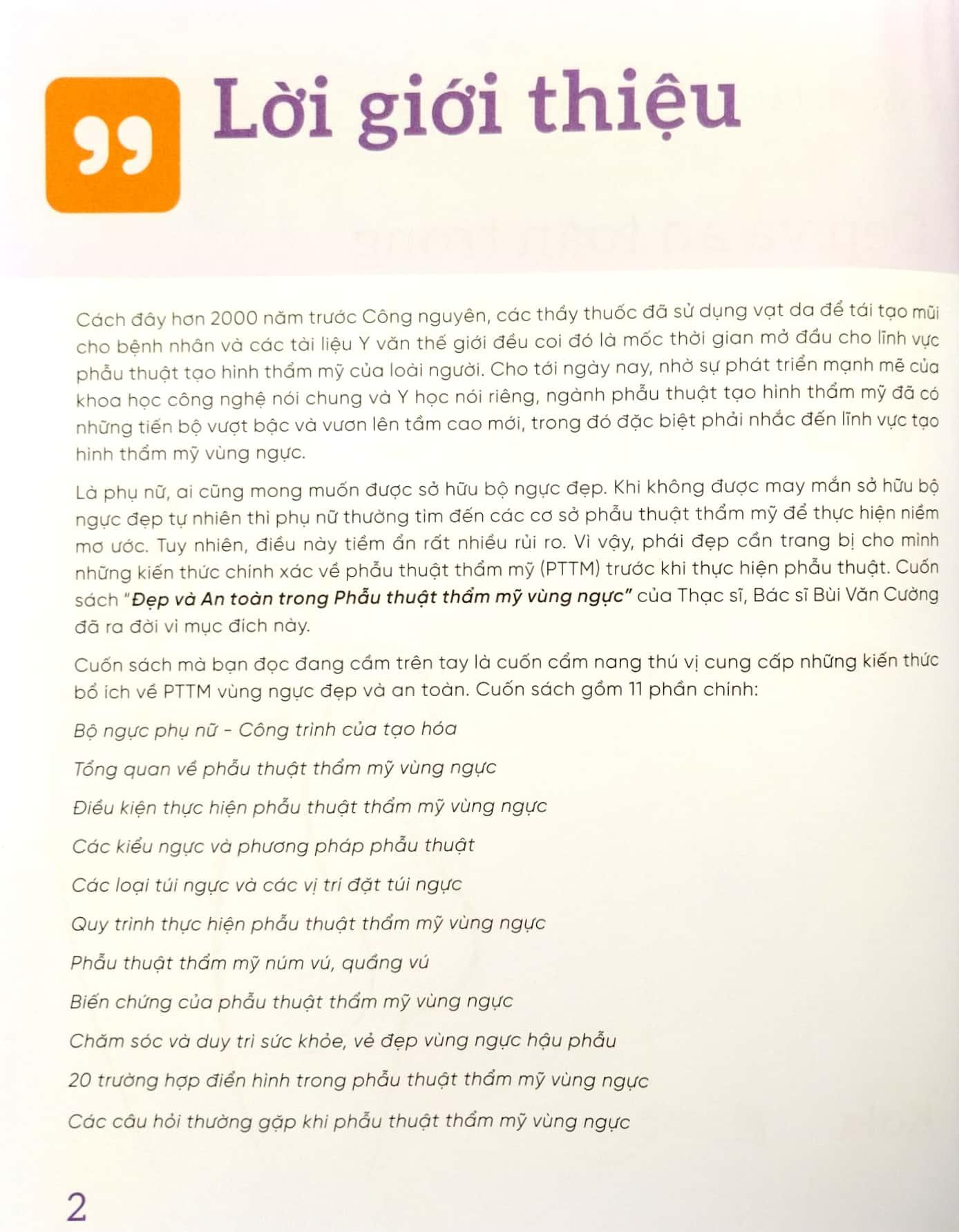 Đẹp Và An Toàn Trong Phẫu Thuật Thẩm Mỹ Vùng Ngực Cách đây hơn 2000 năm trước Công nguyên, các thầy thuốc đã sử dụng vạt da để tái tạo mũi cho bệnh nhân và các tài liệu Y văn thế giới đều coi đó là mốc thời gian mở đầu cho lĩnh vực phẫu thuật tạo hình thẩm mỹ của loài người. Cho tới ngày nay, nhờ sự phát triển mạnh mẽ của khoa học công nghệ nói chung và Y học nói riêng, ngành phẫu thuật tạo hình thẩm mỹ đã có những tiến bộ vượt bậc và vươn lên tầm cao mới, trong đó đặc biệt phải nhắc đến lĩnh vực tạo hình thẩm mỹ vùng ngực. Là phụ nữ, ai cũng mong muốn được sở hữu bộ ngực đẹp. Khi không được may mắn sở hữu bộ ngực đẹp tự nhiên thì phụ nữ thường tìm đến các cơ sở phẫu thuật thẩm mỹ để thực hiện niềm mơ ước. Tuy nhiên, điều này tiềm ẩn rất nhiều rủi ro. Vì vậy, phái đẹp cần trang bị cho m.ình những kiến thức chính xác về phẫu thuật thẩm mỹ (PTTM) trước khi thực hiện phẫu thuật. Cuốn sách “Đẹp và An toàn trong Phẫu thuật thẩm mỹ vùng ngực” của Thạc sĩ, Bác sĩ Bùi Văn Cường đã ra đời vì mục đích này. Cuốn sách mà bạn đọc đang cầm trên tay là cuốn cẩm nang thú vị cung cấp những kiến thức bổ ích về PTTM vùng ngực đẹp và an toàn. Cuốn sách gồm 11 phần chính: Bộ ngực phụ nữ – Công trình của tạo hóa Tổng quan về phẫu thuật thẩm mỹ vùng ngực Điều kiện thực hiện phẫu thuật thẩm mỹ vùng ngực Các kiểu ngực và phương pháp phẫu thuật Các loại túi ngực và các vị trí đặt túi ngực Quy trình thực hiện phẫu thuật thẩm mỹ vùng ngực Phẫu thuật thẩm mỹ núm vú, quầng vú Biến chứng của phẫu thuật thẩm mỹ vùng ngực Chăm sóc và duy trì sức khỏe, vẻ đẹp vùng ngực hậu phẫu 20 trường hợp điển hình trong phẫu thuật thẩm mỹ vùng ngực Các câu hỏi thường gặp khi phẫu thuật thẩm mỹ vùng ngực Điểm nổi bật của cuốn sách là tổng hợp ra 20 trường hợp điển hình để bạn đọc có cái nhìn toàn diện, thực tế về PTTM vùng ngực, từ đó nhận diện được m.ình thuộc trường hợp nào, nên sử dụng phương pháp gì cho phù hợp với bản thân. Ở phần cuối của cuốn sách nêu ra 35 câu hỏi thường gặp và giải đáp những băn khoăn, e ngại của phái đẹp về quá trình thực hiện PTTM vòng một an toàn. Với mục đích truyền tải cho bạn đọc những thông tin cơ bản, hữu ích về PTTM vùng ngực, hi vọng cuốn cẩm nang này sẽ là người bạn tin cậy cho tất cả mọi người để những ai đã và đang quan tâm tới lĩnh vực PTTM vùng ngực có thể tự tin làm đẹp một cách an toàn, lựa chọn cơ sở thẩm mỹ uy tín, phù hợp với bản thân.