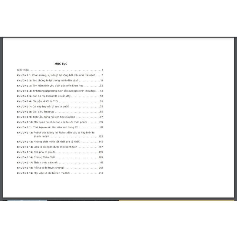 Xem xét tất tần tật mọi điều xoay quay con người dưới góc nhìn khoa học, Điều Gì Khiến Chúng Ta Trở Thành Con Người? mang đến lời giải đáp đáng tin cậy và cụ thể về tình yêu, khiếu hài hước, khả năng cảm thụ âm nhạc, hay đủ mọi chuyện liên quan đến đồng hồ sinh học và nhịp s.ống của bạn, lí do bạn cảm thấy buồn ngủ hoặc đói, điều gì sẽ xảy ra khi bạn già đi, và cơ thể sẽ biến đổi thế nào sau khi bạn “nhắm mắt xuôi tay”… Hãy bắt đầu chuyến du hành khoa học khám phá sự sống qua mỗi trang sách ngay thôi nào!!