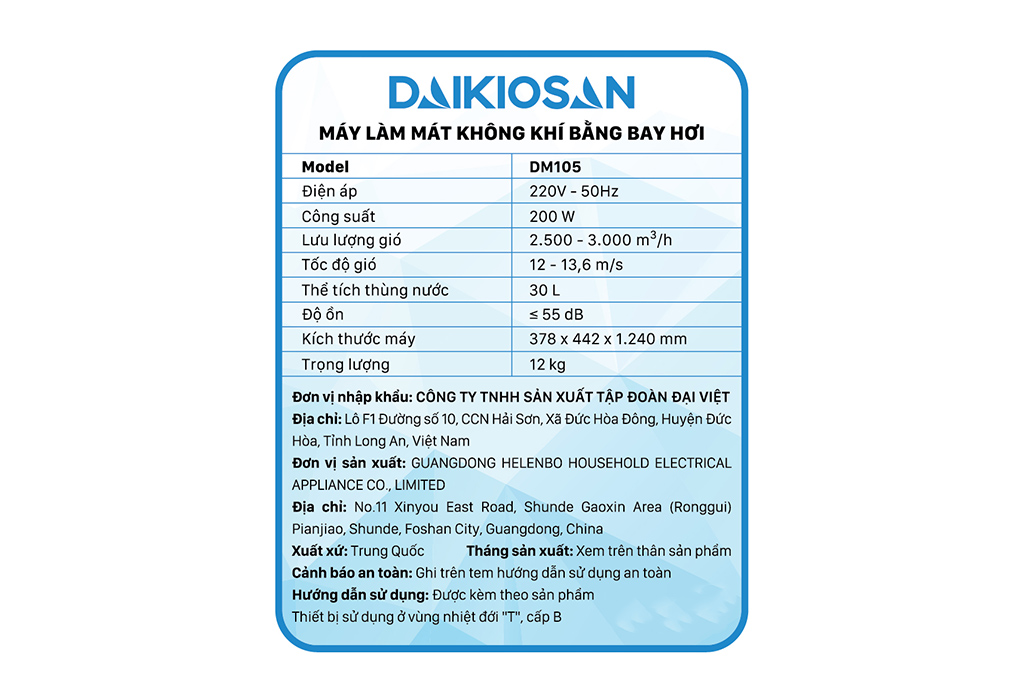 Giới thiệu sản phẩm: Quạt điều hòa dân dụng Daikiosan DM103 - chính hãng Nếu bạn đang tìm kiếm một giải pháp hạ nhiệt nhanh, an toàn, tiết kiệm điện lại có thể diệt khuẩn, khử mùi, lọc bụi cho không gian thì máy làm mát Daikiosan DM103 chính là siêu phẩm dành cho chính bạn và gia đình bạn. Trong thời điểm không khí ngày càng ô nhiễm, làm sao để có không gian sạch mát cho cả gia đình chính là ưu tiên hàng đầu của các bậc cha mẹ. Hạ nhiệt tức thì, đập tan nắng nóng Với công nghệ làm mát bằng hơi nước tự nhiên, máy làm máy Daikiosan DM103 cho ra khí mát với nhiệt độ, cân bằng độ ẩm siêu lý tưởng cho gia đình bạn. Sản phẩm cũng không gây sốc nhiệt, khô da như điều hòa. Hiệu suất làm mát mạnh mẽ Máy làm mát Daikiosan DM103 sở hữu công suất 175W, tốc độ gió từ 7,8 - 9,7 m/s giúp máy phân phối không khí mát rộng rãi, đặc biệt hiệu quả trên diện tích lớn từ 45-55m2. Tốc độ gió linh hoạt Máy làm mát không khí Daikiosan DM103 mang đến trải nghiệm làm mát tối ưu với 3 tốc độ gió đa dạng: cao, trung bình, thấp, giúp bạn linh hoạt điều chỉnh theo nhu cầu và điều kiện môi trường. Chế độ đảo và điều chỉnh đa chiều Siêu phẩm có chế độ đảo gió 4 chiều giúp phân tán gió ở diện tích rộng hơn, gió được phân tán đồng đều cho không gian làm mát. Hạ nhiệt ngày nắng nóng bằng nước và đá khô Để dập tắt nắng nóng những ngày cao điểm, máy làm mát Daikiosan DM103 sở hữu thùng chứa nước có dung tích lên đến 72L, cho phép máy làm mát liên tục lên đến 8 giờ, giảm bớt công việc nạp nước liên tục. Máy còn có cảm biến mực nước giúp bảo vệ máy bơm và tăng tuổi thọ cho sản phẩm. Ngoài ra, máy đi kèm với 2 hộp đá khô, giúp làm mát nhanh chóng và hiệu quả hơn, đồng thời tạo ra không khí mát mẻ ngay lập tức. Bạn chỉ cần cho đá khô vào tủ lạnh để đông xong đó đưa ra sử dụng là được. Diệt khuẩn, khử mùi và lọc bụi cho không khí sạch lành Ứng dụng công nghệ Ag+ duy nhất Được trang bị công nghệ diệt khuẩn Ag+, tiêu diệt đồng thời nhiều loại vi sinh vật và vi khuẩn gây bệnh độc hại. Hạn chế mùi hôi khó chịu trong nước ở thùng chứa, đảm bảo không khí trong lành và an toàn. Lọc bụi công nghệ kép Máy sở hữu lọc bụi 2 lớp giúp cho không khí sạch, trong lành hơn cho gia đình bạn Độ ồn thấp Với mức độ ồn dao động từ 55-68 dB, Máy làm mát không khí Daikiosan DM103 giữ cho không gian sống yên tĩnh và thoải mái, không làm ảnh hưởng đến sự thoải mái của bạn. Linh phụ kiện bền bỉ, cùng bạn vượt thời gian Máy làm mát không khí Daikiosan DM103 hoạt động bền bỉ nhờ trang bị nhiều linh kiện chất lượng: Motor nguyên chất, có độ bền gấp 1.5 - 2 lần so với các loại thông thường. Thân máy làm bằng nhựa cao cấp an toàn cho sức khỏe. Bo mạch phủ lớp chống oxy hóa, chống ẩm, giúp tăng thêm tuổi thọ cho sản phẩm. Máy có thêm tính năng tự động ngắt bơm khi hết nước, giúp hạn chế các sự cố cháy nổ và đảm bảo tuổi thọ của bơm.