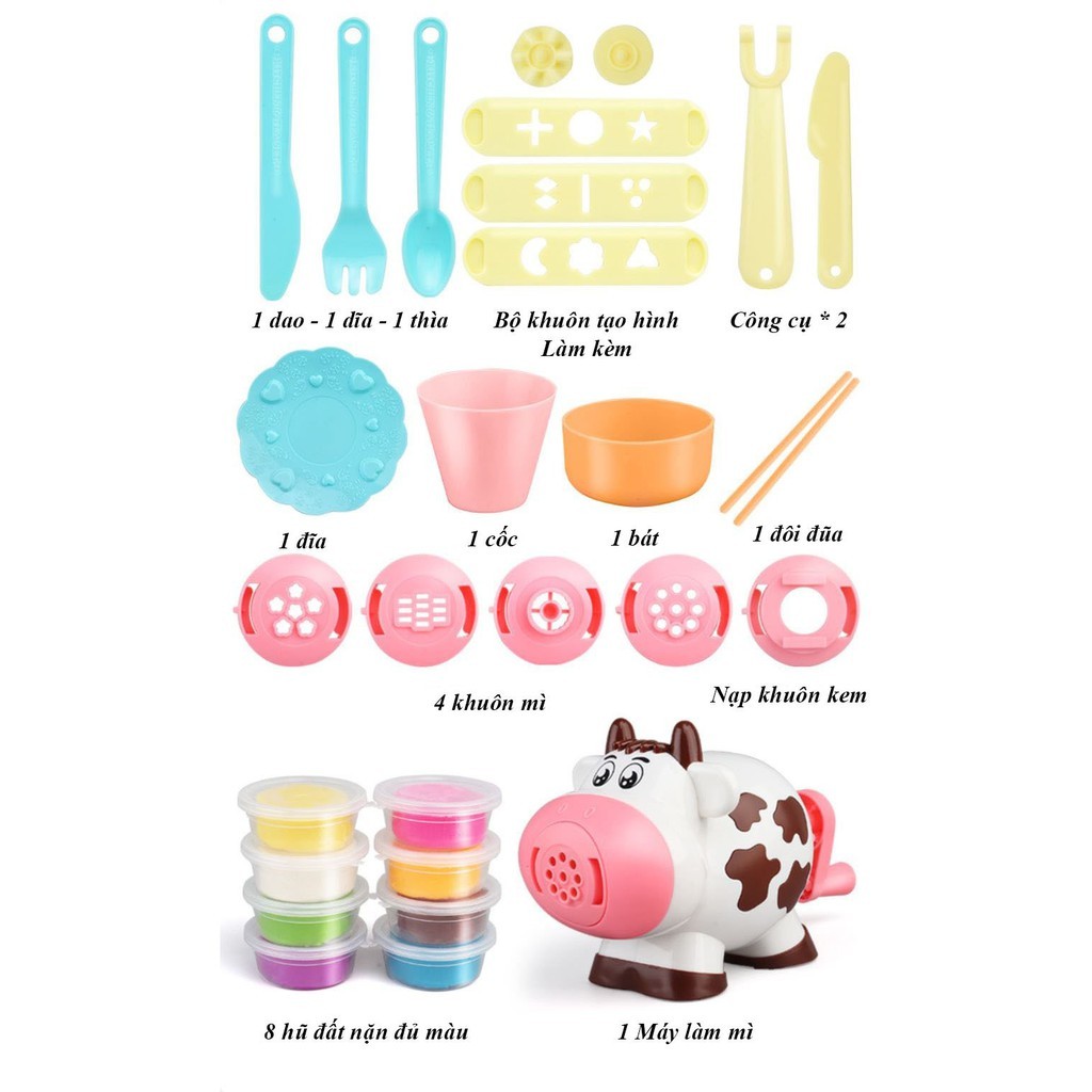 • Sản phẩm gồm: 1 chú bò sữa kích thước 18129 cm, 8 hộp đất nặn dẻo màu khác nhau, 19 công cụ tạo hình gồm 4 khuôn, thìa, dĩa, cốc