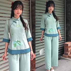 quần áo Phật tử cổ tàu cài chéo - đồ lam đi chùa Sen Hồng - set Phật tử nữ đẹp 0898553583