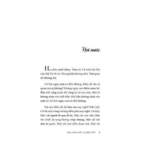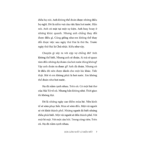 Đơn giản nhất là biến mất I. Giới Thiệu Sách "Đơn giản nhất là biến mất" là tập truyện ngắn chủ yếu xoay quanh K, nhân vật xuất hiện ở nhiều nơi, trong nhiều câu chuyện, đôi khi như một nhân chứng, đôi khi chỉ là một bóng dáng. Không có gì rõ ràng về K, cũng không có gì thực sự cố định trong những mẩu chuyện này, chúng có thể là những giấc mơ, những ký ức, hoặc những cuộc hội thoại dang dở. Thành phố, căn phòng, bến tàu trong tập truyện có thể là bối cảnh cho một cuộc chia ly hoặc một cuộc gặp. Ở đó, có những người đã rời đi từ rất lâu, những lời hứa không ai nhắc lại. K không nói nhiều, hoặc có thể K đã từng nói, nhưng chẳng ai nhớ nổi. Những câu chuyện cứ thế tiếp diễn, không theo một trật tự nào. Một ngày trôi qua, rồi một ngày khác. Mọi thứ đều có thể là kết thúc hoặc chỉ là một đoạn tạm dừng. Đôi khi, người ta gọi tên nhau, hay nhắc đến nhau. Nhưng thường thì không để làm gì cả.