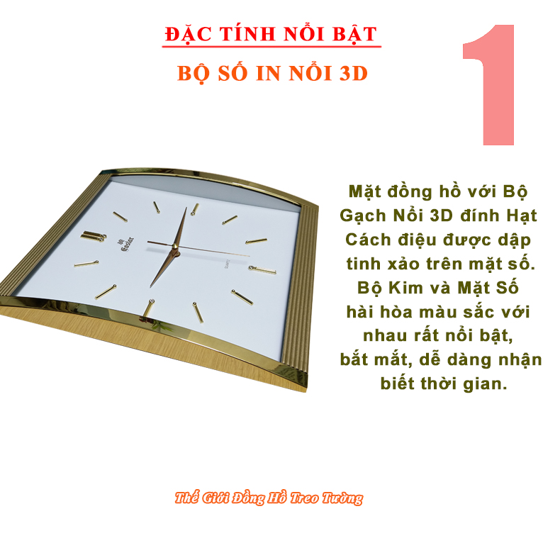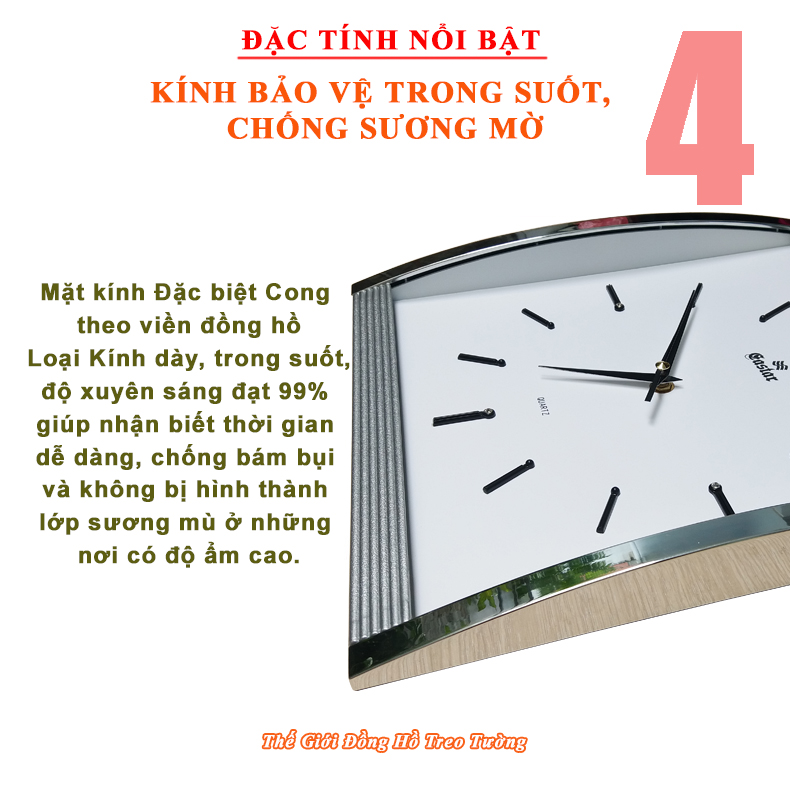 • Loại: Đồng hồ Cao cấp, Mặt kính cong, Đồng hồ Kim trôi, Đồng hồ treo tường 3D công nghệ Thạch anh (Quartz) chạy kim (Analogue), Loại máy kim trôi chạy êm ái, không phát ra tiếng tíc tắc.