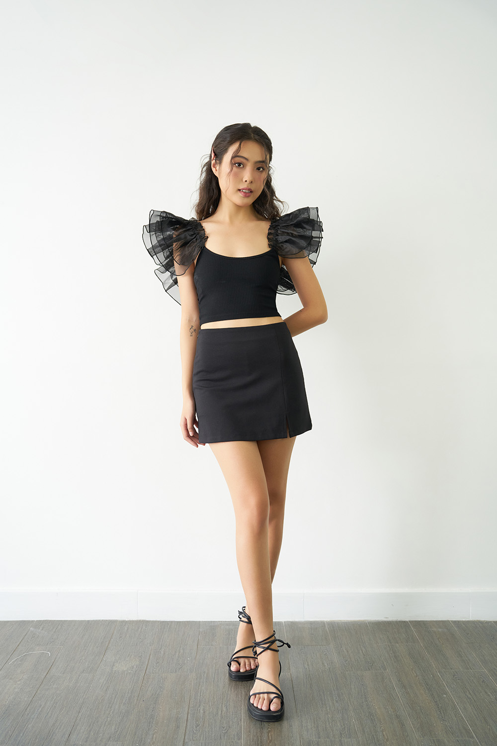 ✨DOTTIE - Áo phối vải tay cánh tiên - Đen - T0707