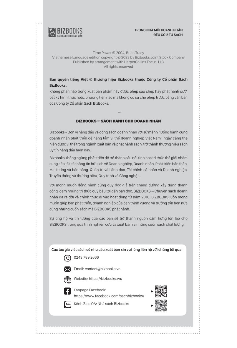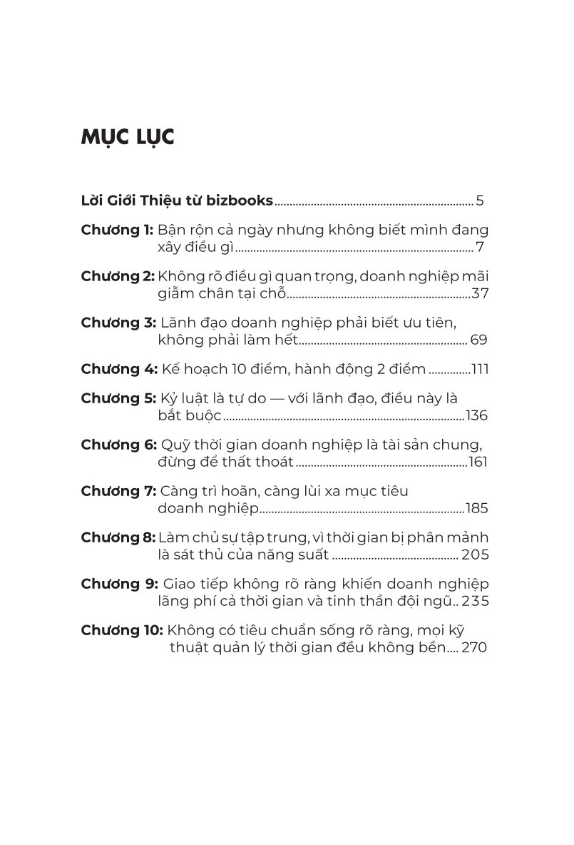 - Bạn sẽ nhận ra: không thể quản lý thời gian nếu không đặt tiêu chuẩn sống rõ ràng Chương 10 kết lại cuốn sách bằng một góc nhìn khác biệt: tất cả kỹ thuật quản lý thời gian sẽ trở nên vô nghĩa nếu bạn không sống có nguyên tắc, có tiêu chuẩn cá nhân rõ ràng. Người đọc nói gì về cuốn sách này? Ngô Minh Thành – Giám đốc điều hành ngành logistic: “Tôi từng dùng công cụ quản lý thời gian, nhưng vẫn luôn thấy… thiếu. Cuốn sách này giúp tôi thay đổi từ gốc: không còn là xử lý việc nhiều hơn, mà là chọn đúng việc. Sau 2 tuần áp dụng chương 3 và 5, tôi đã cắt 12 cuộc họp mỗi tháng và vẫn kiểm soát được tiến độ toàn bộ hệ thống.” Trần Ngọc Hân – Quản lý Marketing cấp cao: “Tôi cứ tưởng mình đang giỏi multitask. Nhưng đọc đến chương 8, tôi mới hiểu vì sao mình luôn mệt mỏi mà không bứt phá. Sách này không giúp tôi ‘làm nhiều’, mà giúp tôi ‘làm sâu’.” Nguyễn Văn Tín – Đồng sáng lập startup công nghệ: “Đọc đến chương 10, tôi lặng người. Trước giờ tôi sống… mặc định, không đặt tiêu chuẩn. Và tôi hiểu vì sao đội ngũ cũng thế. Sau cuốn sách này, tôi không chỉ thay đổi lịch làm việc – mà thay đổi cách tôi làm lãnh đạo.” Đây không phải cuốn sách về quản lý thời gian – mà là cuốn sách tái thiết vai trò lãnh đạo Brian Tracy không dạy bạn làm nhanh hơn. Ông dạy bạn làm đúng việc, đúng lúc, đúng tư duy – như một nhà lãnh đạo thực thụ. Sau cuốn sách này, bạn sẽ không còn hỏi: “Hôm nay tôi có bao nhiêu việc?” Mà bạn sẽ bắt đầu hỏi: “Việc gì hôm nay tạo ra tác động chiến lược?” Và nếu bạn muốn làm chủ thời gian rồi – hãy tiếp tục làm chủ hệ thống Đừng chạy nữa – Dùng thời gian như một lãnh đạo là một phần trong bộ sách giúp người lãnh đạo SME tái cấu trúc tư duy, nâng cấp năng lực và kiến tạo hệ thống bền vững. Tiếp tục hành trình này cùng Brian Tracy với các cuốn: Tập Trung – Để Bứt Phá: Làm ít hơn nhưng sâu hơn, đúng hơn – theo đúng tư duy lãnh đạo chiến lược Tăng Tốc Doanh Nghiệp: 21 phương pháp hành động để tối ưu hệ thống, bứt phá kết quả Lãnh Đạo Thật, Đừng Chỉ Ngồi Ghế: Dẫn dắt bằng ảnh hưởng, hành vi và sự trưởng thành từ bên trong Giữ Ai – Buông Ai: Xử lý nhân sự trì trệ và xây đội ngũ có trách nhiệm Tạo Vận – Đừng Chờ Thời: Tư duy chủ động để đón thời cơ, thay vì chờ may mắn Tái Sinh Doanh Nghiệp: Hành trình phục hồi và xây lại hệ thống sau khủng hoảng Mỗi cuốn là một mảnh ghép – cả bộ là bản đồ phát triển toàn diện của người lãnh đạo thực thụ. Và có thể, hành trình ấy bắt đầu bằng một thay đổi nhỏ – trong cách bạn dùng thời gian hôm nay.