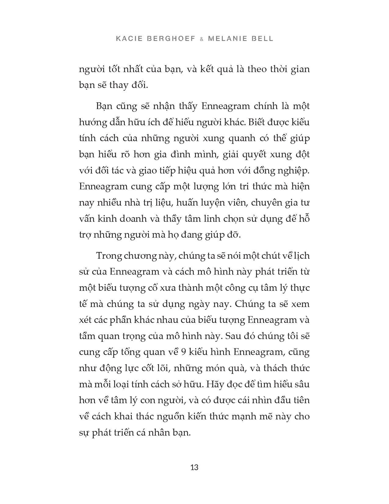 Cuốn sách cung cấp cho bạn một các nhìn tổng quan rất thực tế về khái niệm Enneagram và cách mô hình này hoạt động. Nó sẽ dẫn bạn đến với nguồn tài liệu để bạn có thể tìm hiểu thêm, bao gồm các bài kiểm tra tính cách mà sẽ giúp bạn khám phá được kiểu hình tính cách của chính mình. Từ đó bạn sẽ khám phá ra cách để ứng dụng những thông tin vào công việc, các mối quan hệ và cuộc sống hằng ngày của bạn.