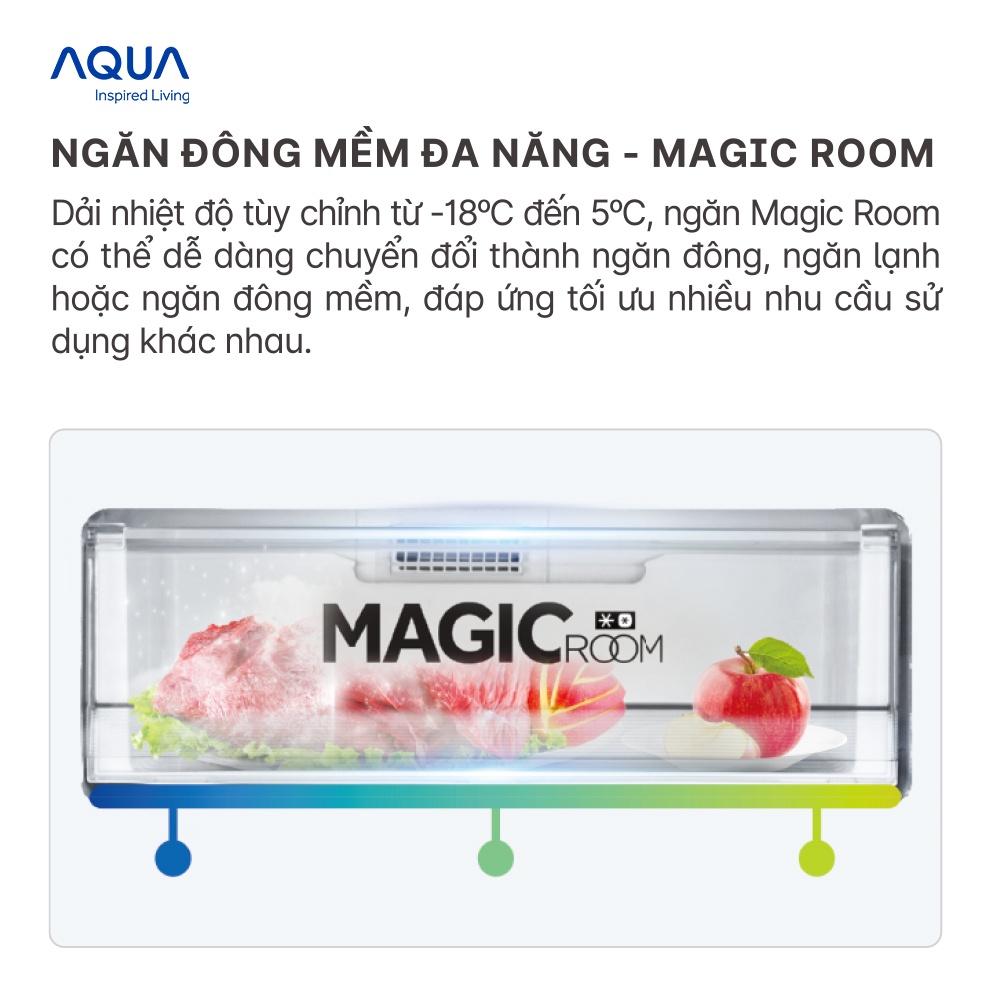Thiết kế hiện đại, mặt gương sang trọng  Tủ lạnh Aqua Inverter 324 lít AQR-IG378EB GB có thiết kế mặt gương màu đen sang trọng, kết hợp với bảng điều khiển cảm ứng bên ngoài cùng kiểu dáng ngăn đá dưới hiện đại sẽ mang đến vẻ đẹp đẳng cấp cho không gian nội thất của gia đình. Dung tích 324 lít dành cho gia đình 3 - 4 người Bên cạnh thiết kế bắt mắt bên ngoài, chiếc tủ lạnh Aqua AQR-IG378EB GB với dung tích 324 lít cùng cách sắp xếp ngăn chứa hợp lý bên trong còn là sự lựa chọn lý tưởng cho những gia đình có từ 3 - 4 người sử dụng. Công nghệ Twin Inverter tiết kiệm điện, vận hành êm ái, hạn chế tiếng ồn Công nghệ Twin Inverter giúp cho tốc độ chạy của quạt và máy nén thay đổi theo nhu cầu hoạt động của tủ lạnh. Nhờ vậy, nó sẽ giúp tiết kiệm điện và hạn chế tiếng ồn hơn nhưng vẫn không gây ảnh hưởng đến chất lượng làm lạnh của tủ. Làm lạnh đa chiều mang hơi lạnh lan tỏa đồng đều đến mọi vị trí trong tủ Làm lạnh đa chiều sẽ mang các luồng khí lạnh lan tỏa đến mọi vị trí trong tủ lạnh, đảm bảo cho thực phẩm nhận được đầy đủ hơi lạnh một cách đồng đều, hiệu quả, góp phần làm lạnh nhanh hơn, giúp thực phẩm tươi ngon lâu hơn. Kháng khuẩn khử mùi DEO Fresh giúp không khí trong tủ luôn sạch, thoáng Công nghệ DEO Fresh với Ion bạc Ag+ của tủ lạnh có khả năng tiêu diệt mùi hôi và các vi khuẩn gây hại, trả lại không gian trong lành, sạch khuẩn cho thực phẩm bên trong. Ngăn tùy chỉnh nhiệt độ Magic Room từ -18 đến 5 độ C, đáp ứng nhu cầu dùng đa dạng Điểm độc đáo nổi bật trên chiếc tủ lạnh Inverter này đó chính là trang bị ngăn tùy chỉnh nhiệt độ Magic Room. Không chỉ là một ngăn cấp đông mềm thông thường, với ngăn Magic Room, bạn có thể tùy ý thay đổi nhiệt độ ngăn sao cho phù hợp với nhu cầu sử dụng từ -18 đến 5 độ C. ​ Ngăn rau quả giữ ẩm tối ưu, giúp rau củ và quả được tươi ngon, mọng nước Ngăn rau củ của tủ lạnh 2 cửa này có thể lưu giữ được độ ẩm tối ưu, tránh mất nước hiệu quả, cho rau củ và quả luôn giữ được độ tươi ngon, mọng nước trong suốt thời gian bảo quản. Chức năng Holiday giúp tủ không bị mốc hay có mùi hôi khi đi xa mà vẫn tiết kiệm điện Với chức năng Holiday, tủ lạnh Aqua có thể ngăn ngừa tình trạng nấm mốc gây mùi khi không sử dụng trong thời gian dài. Nhờ vậy, bạn có thể yên tâm hơn khi thực phẩm vẫn được bảo quản tốt mà không bị bám mùi hôi, nấm mốc trong lúc bạn đi công tác hoặc du lịch cùng gia đình một thời gian. Hơn nữa chức năng này còn giúp tiết kiệm đáng kể chi phí điện cho gia đình, quá tuyệt vời phải không nào?