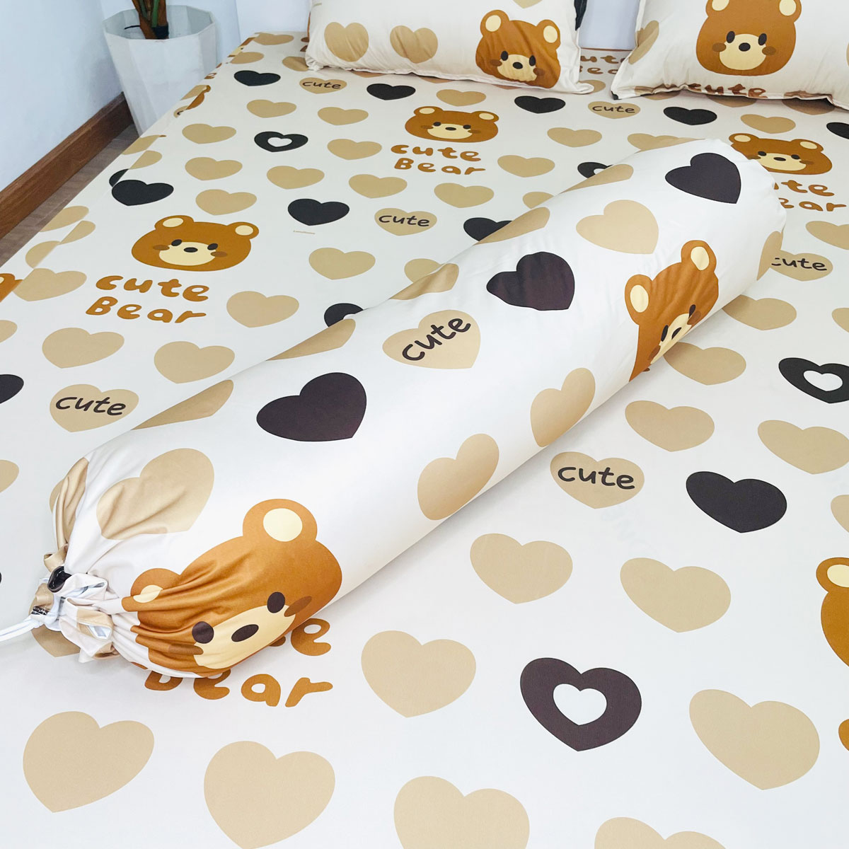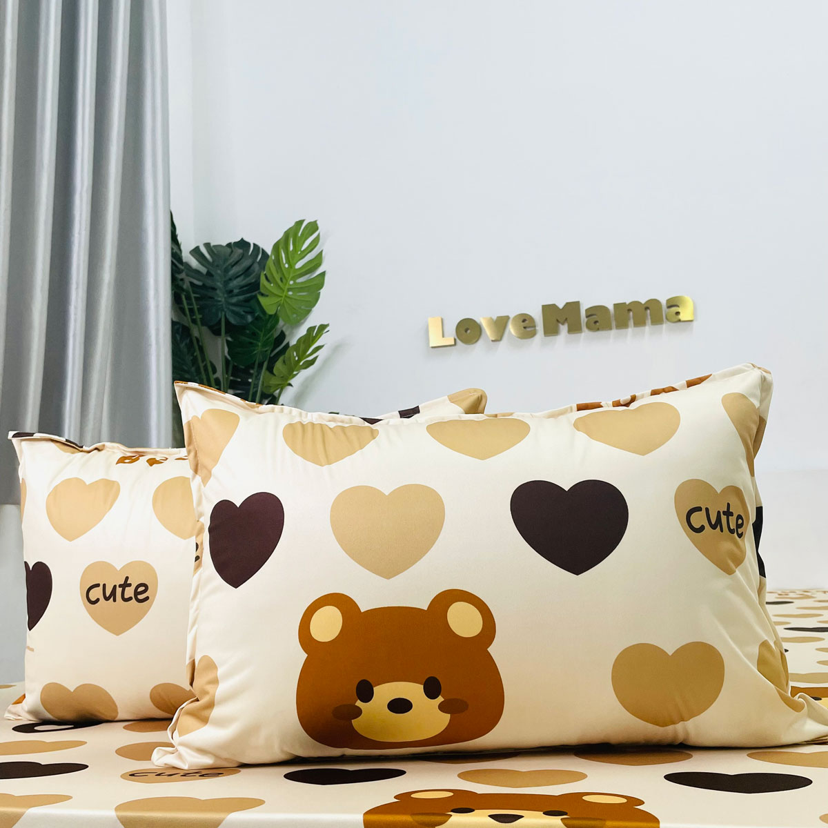 Họa tiết: Họa tiết gấu cute bear màu nâu nhạt và màu vàng nhạt cùng hình trái tim rất đáng yêu, giúp bé thoải mát thư giãn mỗi khi ngủ.