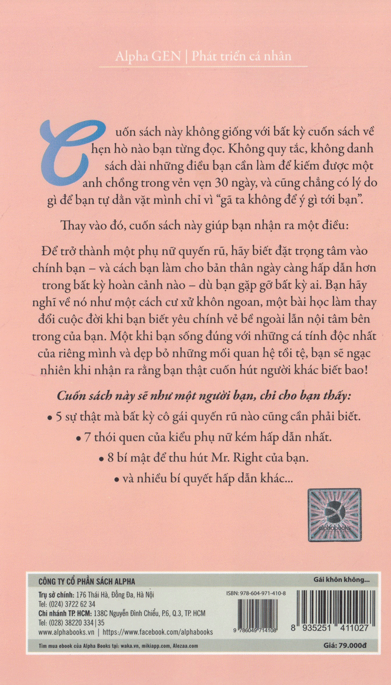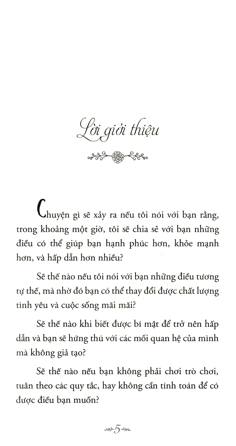Thay vào đó, cuốn sách này giúp bạn nhận ra một điều: Để trở thành một phụ nữ quyến rũ, hãy biết đặt trọng tâm vào chính bạn – và cách bạn làm cho bản thân ngày càng hấp dẫn hơn trong bất kỳ hoàn cảnh nào – dù bạn gặp gỡ bất kỳ ai. Bạn hãy nghĩ về nó như một cách cư xử khôn ngoan, một bài học làm thay đổi cuộc đời khi bạn biết yêu chính vẻ bề ngoài lẫn nội tâm bên trong của bạn. Một khi bạn sống đúng với những cá tính độc nhất của riêng mình và dẹp bỏ những mối quan hệ tồi tệ, bạn sẽ ngạc nhiên khi nhận ra rằng bạn thật cuốn hút người khác biết bao!