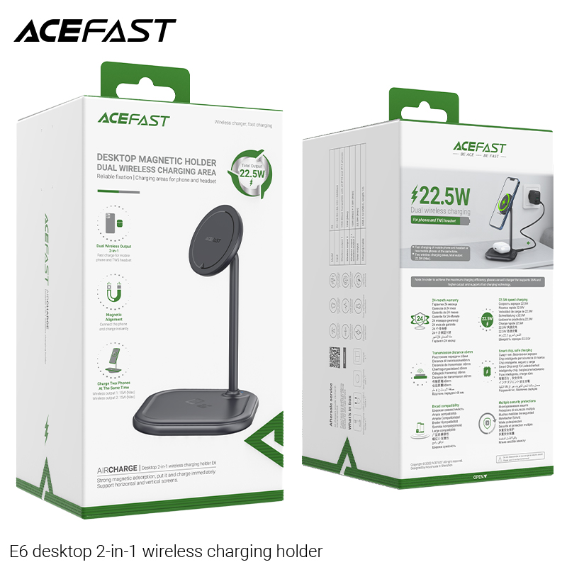 *Lưu ý: Đế sạc phù hợp với các thiết bị có hỗ trợ sạc không dây, riêng chức năng sạc mag.safe chỉ hỗ trợ cho các dòng từ i.phone 12 series trở lên và các dòng tai nghe có hỗ trợ sạc mag.safe. Lực hút từ tính chỉ hỗ trợ tốt khi sử dụng ốp lưng có độ dày <=5mm Giá đỡ sạc không dây để bàn 2 in 1 ACEFAST E6 Thông số kỹ thuật: - Input : 5V/ 2A, 9V/ 2A, 12V/ 3A. - Output1: 15W (for mag.safe 7.5W). Output2: 15W Output 1+2: 15W + 7.5W Tổng công suất: 22.5W
