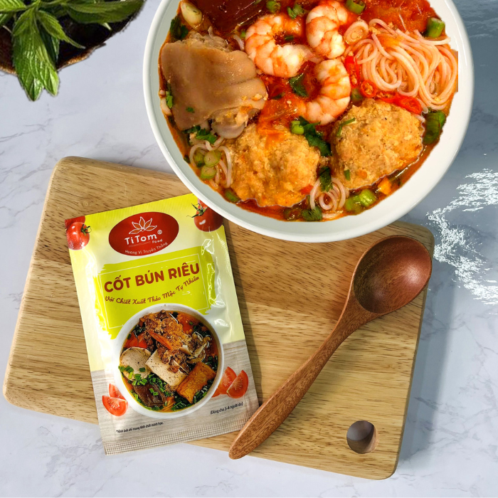 Cảm ơn quý khách đã tin tưởng chọn lựa sản phẩm của Titomfood - Hương vị truyền thống! 1. THÔNG TIN SẢN PHẨM -Cốt bún riêuTitom là gia vị nấu bún riêu nêm sẵn hoàn