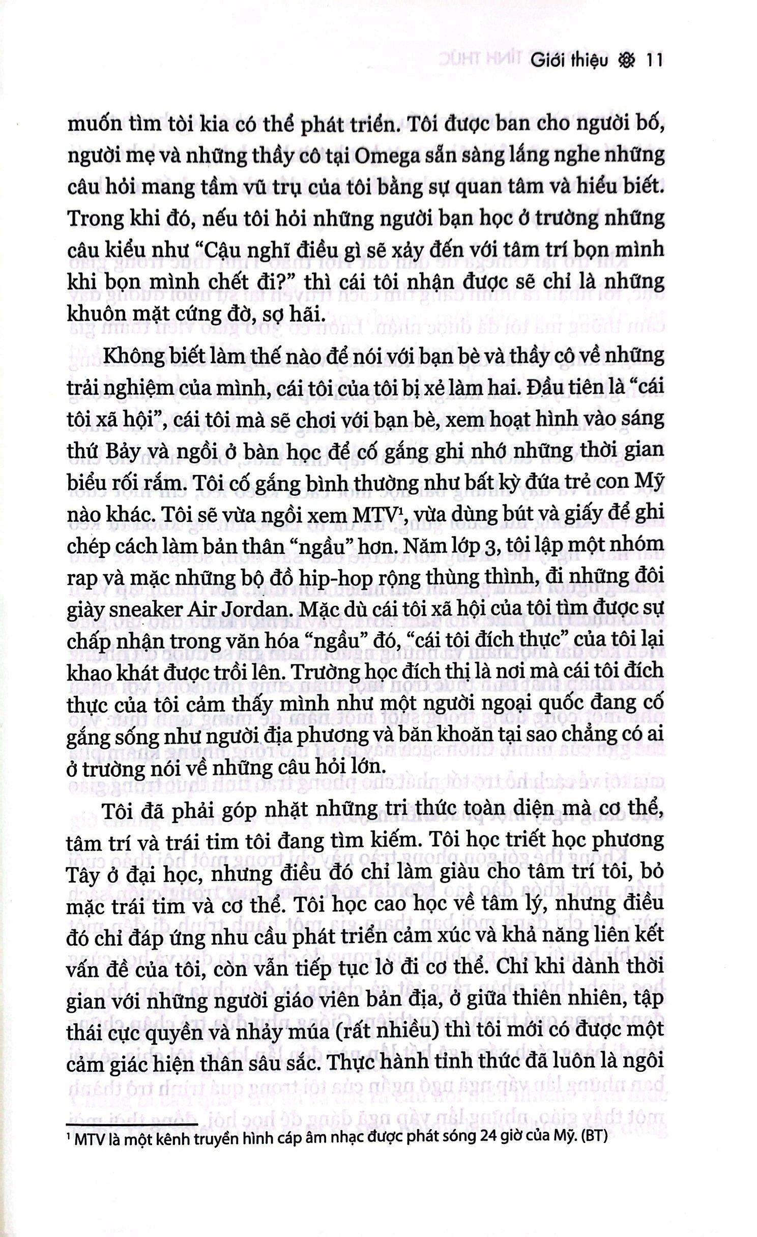 Trên khắp vũ trụ, chỉ có duy nhất một thời điểm và một địa điểm để học tỉnh thức, đó chính là bây giờ và ở đây, bên trong cơ thể chúng ta. Để mở mắt và thật sự nhìn thế giới mà không vướng phải bất kỳ giả định nào, trước tiên, chúng ta phải cảm thấy thoải mái bên trong chính lớp da của m.ình. Công cụ chúng ta dùng để bắt đầu khám phá thế giới bên trong là nhận thức và phương tiện chúng ta dùng để học hỏi là cơ thể. Chúng ta bắt đầu bằng việc học ngôn ngữ của những cảm giác.