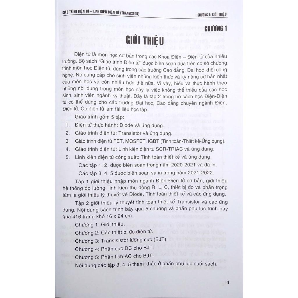 Điện tử là môn học cơ bản trong các Khoa Điện – Điện tử, Cơ điện tử … của nhiều trường. Cuốn “Giáo Trình Điện Tử Linh Kiện Điện Tử Trasistor ” được biên soạn dựa trên cơ sở chương trình môn học Điện tử, dùng trong các trường Cao đẳng, Đại học khối công nghệ. Nó cung cấp cho sinh viên những kiến thức và kỹ năng cơ bản nhất của môn học và còn nhiều hơn thế nữa. Sách trình bày nội dung một cách ngắn gọn, cơ bản và dễ hiểu. Trong sách, các tác giả không đi quá sâu vào kiến thức chuyên ngành cũng như không phân tích quá chi tiết transistor ở góc độ vật lý bán dẫn, sinh viên được giới thiệu lý thuyết vừa đủ và thông qua việc tính toán, thiết kế, giải các bài tập để củng cố kiến thức đã học ở phần lý thuyết. Tất cả kiến thức toán học phù hợp với yêu cầu của môn học. Ở mỗi chương có ví dụ minh họa, câu hỏi và bài tập để sinh viên có thể luyện tập, hiểu sâu hơn những vấn đề mình đã học. Trong quá trình học, sinh viên có thể trao đổi thêm với giảng viên về cách giải các bài tập khó hay được giải đáp các câu hỏi có liên quan đến môn học. Với cách trình bày minh họa dùng nhiều hình ảnh đồ họa, các tác giả hy vọng các sinh viên sẽ nhanh chóng khai thác các thiết bị, linh kiện điện tử trong học thực hành. Giáo trình có thể dùng làm tài liệu tham khảo cho sinh viên các trường Đại học, Cao đẳng có các ngành liên quan đến lĩnh vực này. Phần transistor trường (FET-Mosfet) và IGBT cùng các ứng dụng sẽ được trình bày trong tập tiếp theo: Giáo trình điện tử FET, MOSFET, IGBT và ứng dụng. Dù sách đã được hoàn thành về cơ bản, chắc chắn vẫn còn những sơ xuất ngoài ý muốn chưa được phát hiện, các tác giả rất mong nhận được ý kiến đóng góp của đồng nghiệp và sinh viên để giáo trình đáp ứng được nhu cầu của người học và người dạy trong thời đại công nghệ 4.0 góp phần đổi mới việc dạy và học.