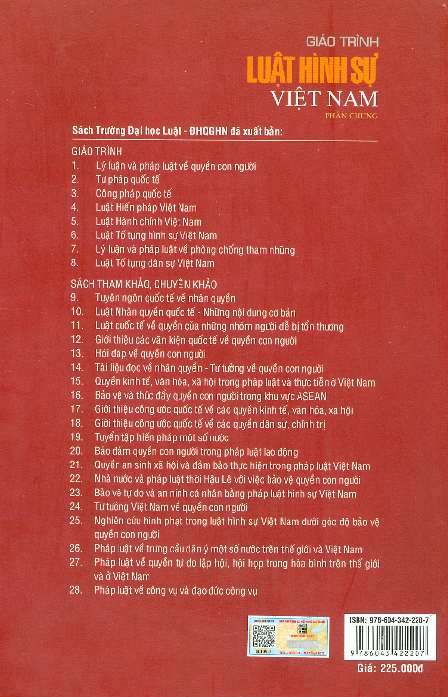 Giáo trình Luật Hình sự Việt Nam - Phần chung Với sự phát triển và đòi hỏi của xã hội, cũng như nhằm phục vụ công tác học tập, nghiên cứu và giảng dạy, Trường Đại học Luật - Đại học Quốc gia Hà Nội đã xuất bản Giáo trình Luật Hình sự Việt Nam - Phần chung với sự tham gia biên soạn của các nhà khoa học luật hình sự có uy tín và những giảng viên có nhiều kinh nghiệm trong lĩnh vực tư pháp hình sự. Cuốn sách bạn đang cầm trên tay đã được tái bản lần thứ nhất có sửa đổi, bổ sung và cập nhật các tri thức mới của khoa học luật hình sự, nội dung các văn bản hướng dẫn thi hành Bộ luật Hình sự năm 2015, sửa đổi, bổ sung năm 2017. Cuốn sách tái bản lần này có một số điểm mới đáng chú ý so với bản in năm 2021: